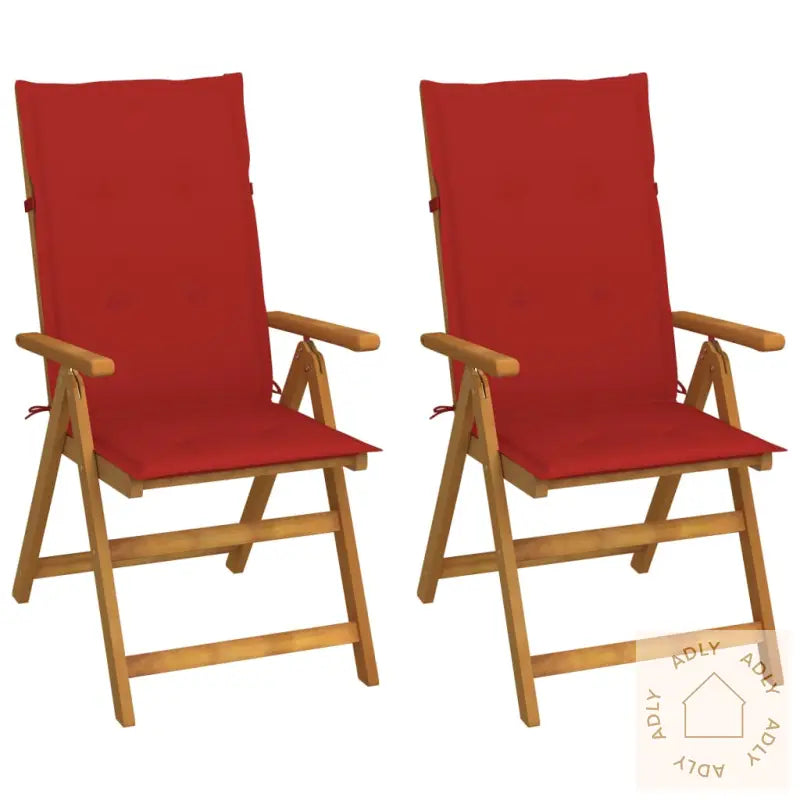 Stolene har justerbare ryggstøtter med fem ulike liggestillinger, så det er alltid enkelt å finne den stillingen som passer deg – enten du vil spise, lese eller bare døs i solen. Putene, som festes både med elastisk stropp bak og tau på sidene, gir ekstra støtte og komfort gjennom lange sommerkvelder. Utestolene er sammenleggbare, slik at du enkelt kan flytte dem rundt eller sette dem vekk når de ikke er i bruk – praktisk både for små hager og store terrasser. Settet leveres komplett med to stoler og to røde puter i slitesterkt polyesterstoff.