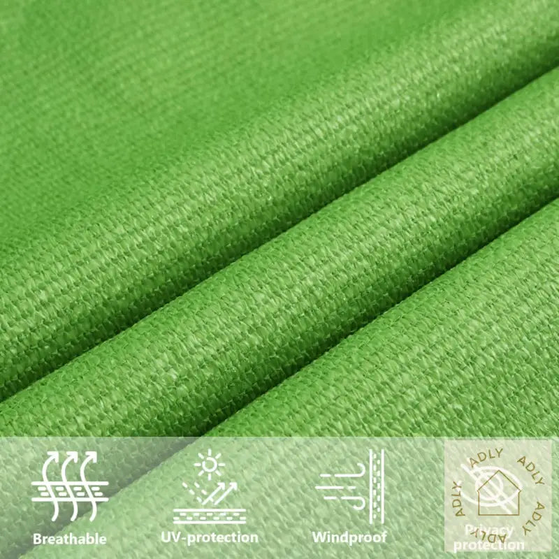 Farge: LysegrønnMateriale: HDPE (høytetthetspolyetylen)Mål: 3,5 x 3,5 x 4,9 mForm: TrekantetOmtrent 90% UV-beskyttelseVind- og vanngjennomtrengendePustende, mugg- og UV-bestandig HDPERustfrie stålfester i hvert hjørne3 x 1,5 m PE-tau følger med