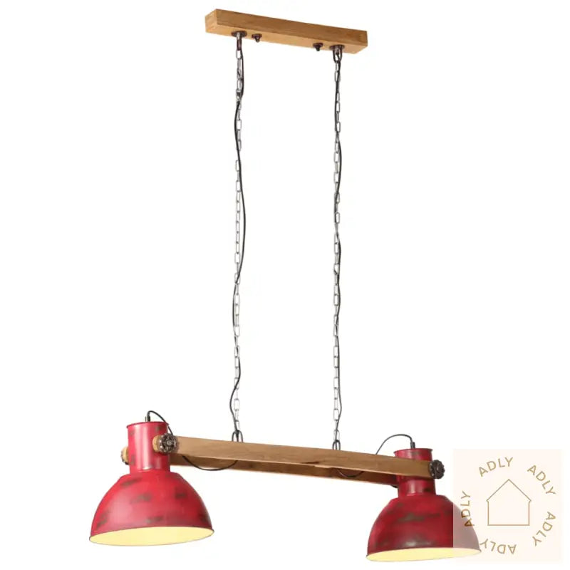 Merk: Lampeskjermene har små “feil” som gir dem et grovt og særegent utseende—en del av den unike, industrielle stilen.Lyspærer følger ikke med.Farge: MørkerødMaterialer: Jern og heltre mango Mål: 85 x 28 x 109 cm (L x B x H)Diameter lampeskjerm: 29 cmSokkeltype: E27Maksimal effekt: 25 W per pæreTo lampeskjermer følger medLavspenningsdirektivSkap en varm og trendy atmosfære med denne hengelampen i heltre mango og jern. Den er både funksjonell og dekorativ, passer til alle som ønsker spennende møbler til hjemmet med et preg av industriell stil.