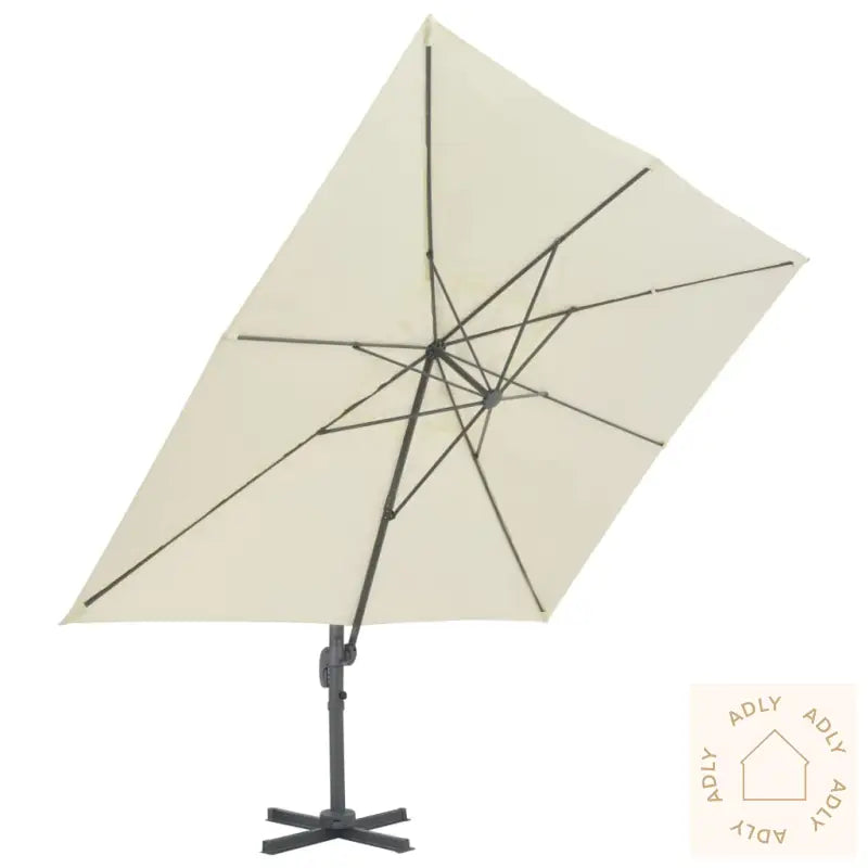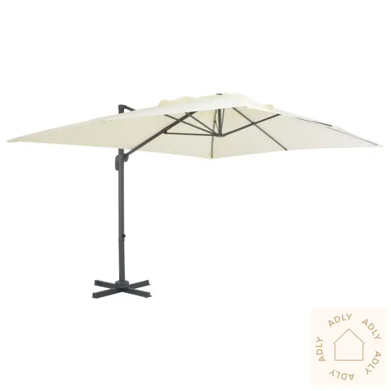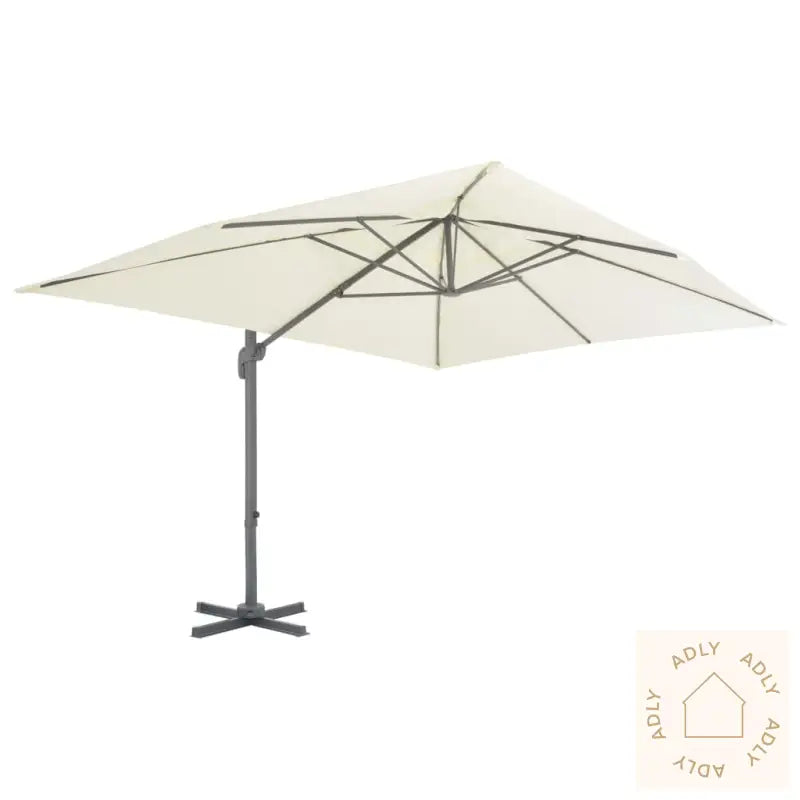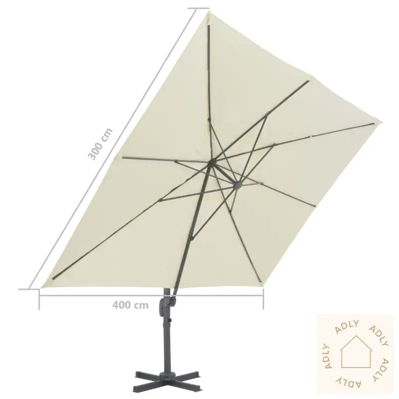 Farge skjerm: sandMaterialer: Stoff med PA-belegg + pulverlakkert aluminiumSamlet mål: 400 x 300 x 268 cm (L x B x H)Mål kryssfot: 100 x 100 cm (L x B)Mål stang: 7 x 5 cm (L x B)Med lufteventil og sveivesystemVippbar og 360-graders roterende designInkluderer 8 aluminiumsspilerStoff: Polyester: 100%