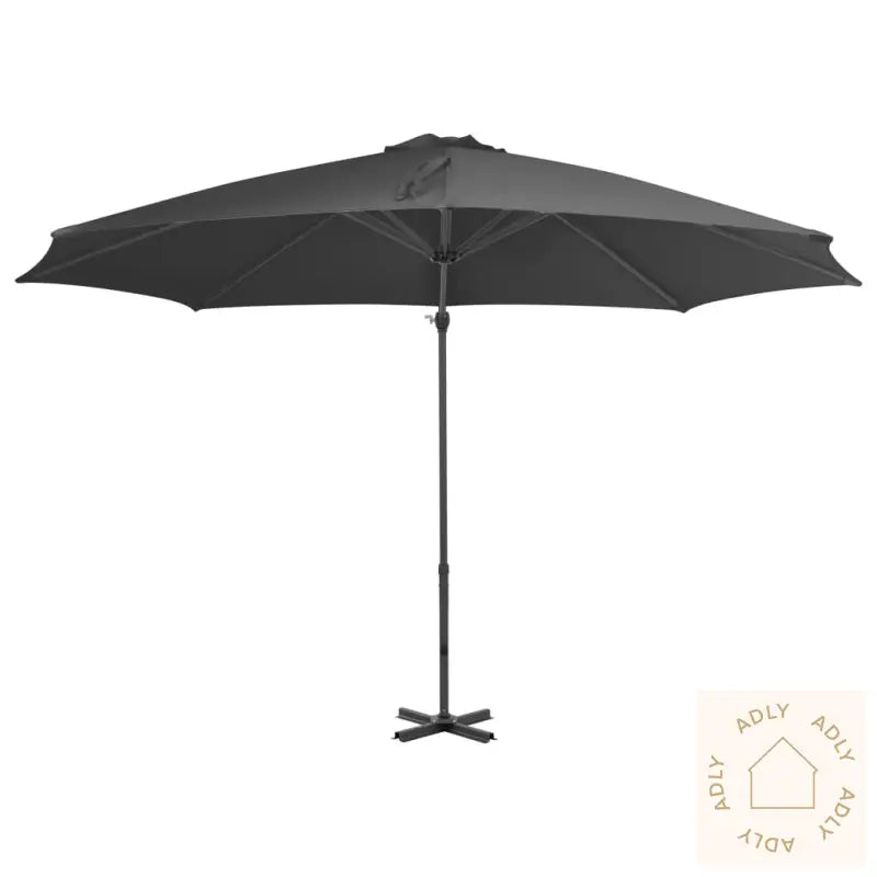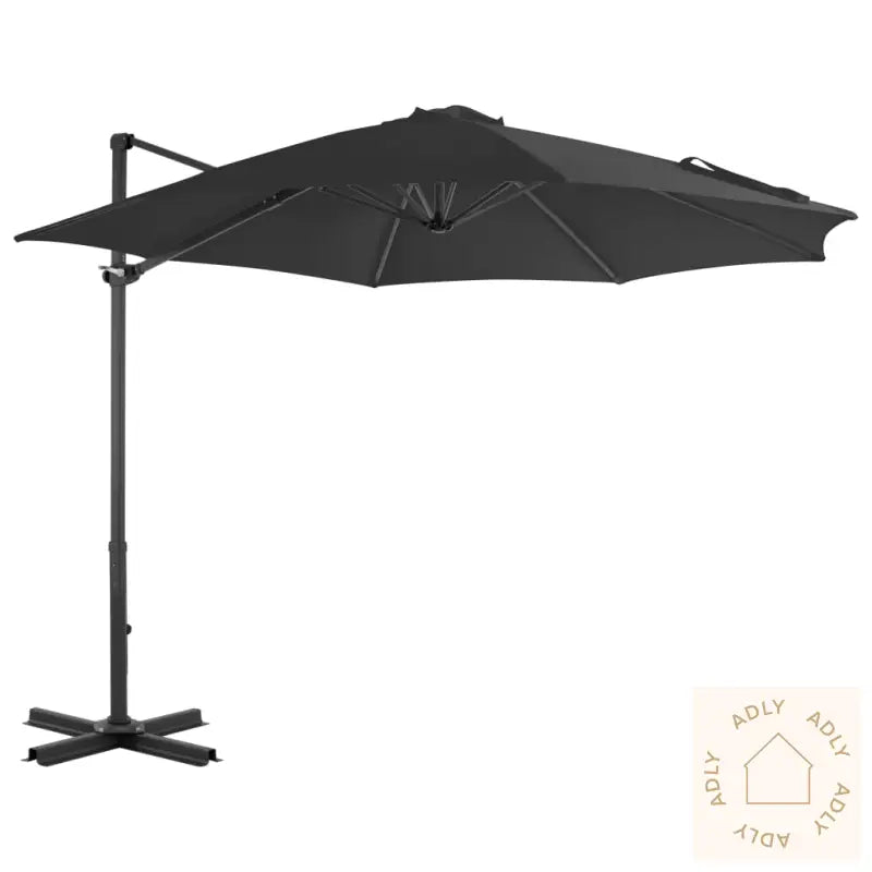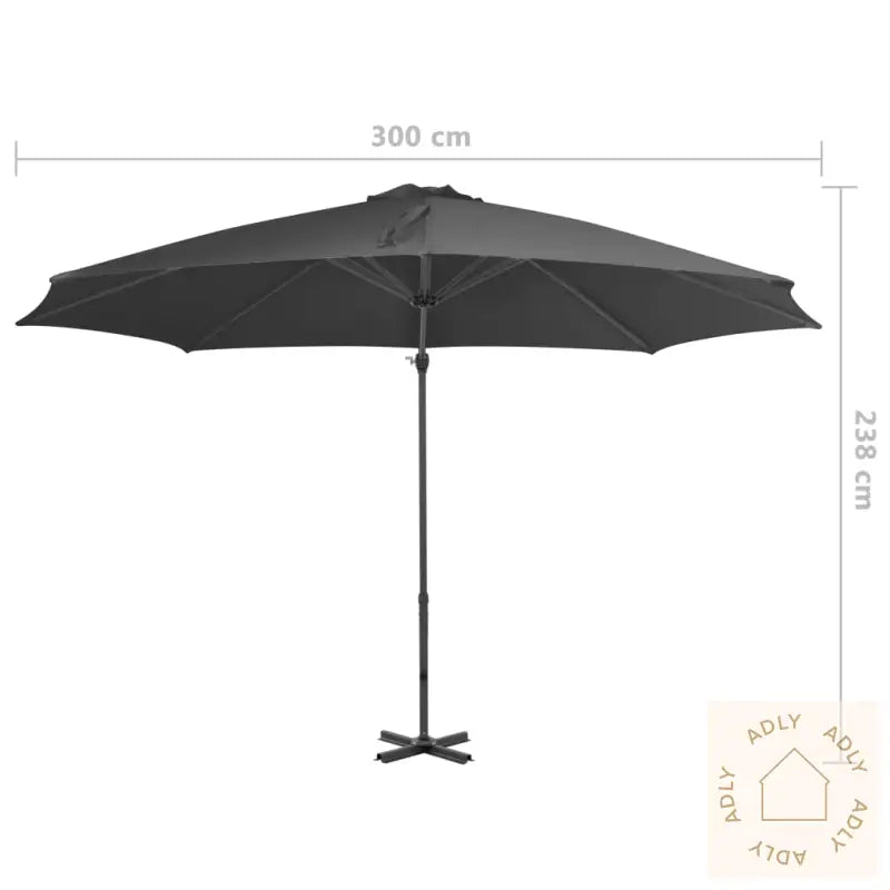 Farge skjerm: antrasittMateriale: stoff med PA-belegg + aluminiumSamlet mål: 300 x 238 cm (diameter x H)Mål kryssbase: 64,5 x 64,5 cm (L x B)Med lufteventil og sveivesystemVippbar og 360-graders roterende designInkluderer 8 aluminiumsspilerStoff: Polyester: 100%