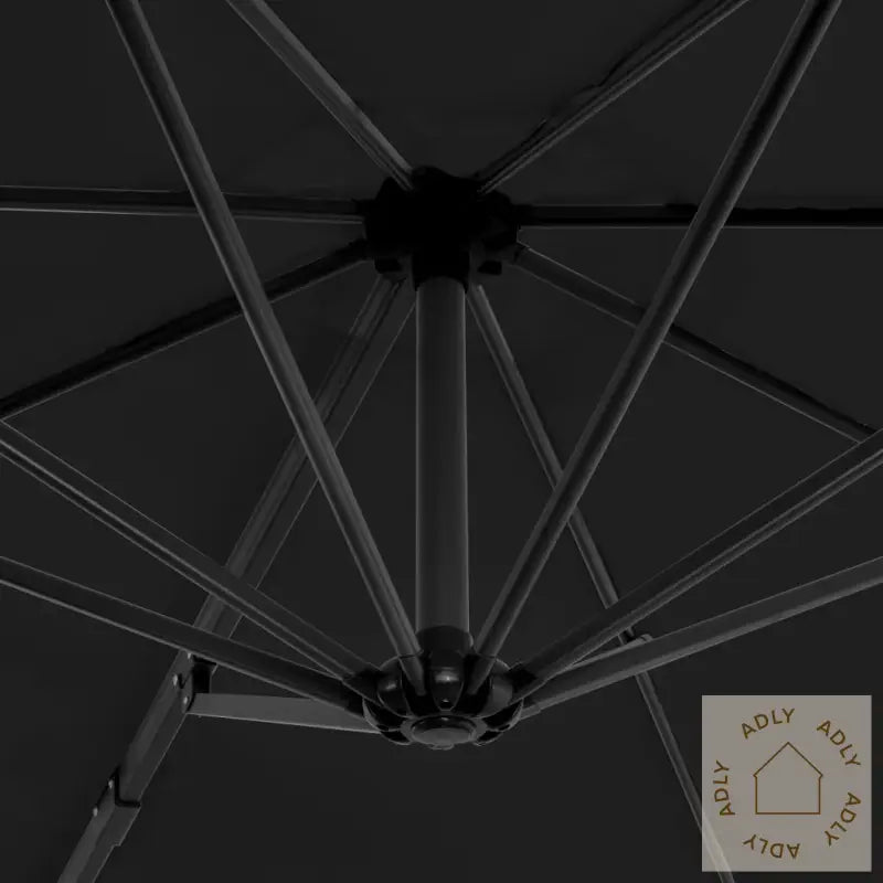 Parasollskjermen er laget av slitesterk, UV-beskyttet og anti-falmende polyester som både er lett å rengjøre og svært holdbar. Dette gir deg optimal beskyttelse mot solen når du slapper av eller underholder gjester ute. Den solide kryssbasen bidrar til ekstra stabilitet, så du trenger ikke bekymre deg hvis det blåser litt. Den smarte, eksklusive designen lar deg vippe parasollen slik at du får skygge hele dagen, også når solen står lavt. Parasollen kan i tillegg roteres 360 grader, så du lett tilpasser skyggen uansett tid på dagen.