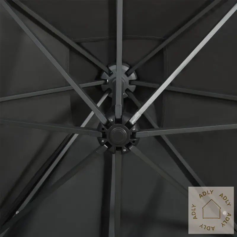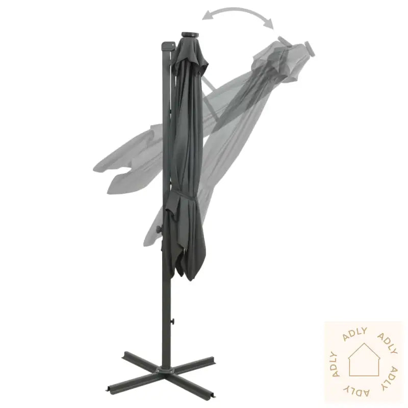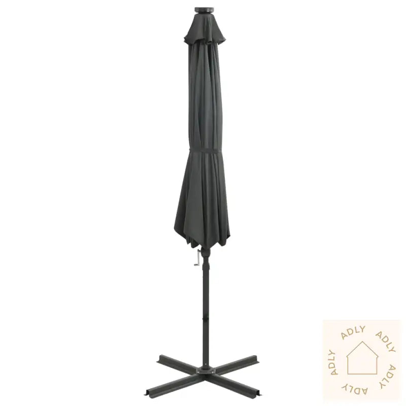 Farge: antrasittMaterialer: stoff med PA-belegg, aluminiumSamlet mål: 300 x 238 cm (diameter x H)Mål kryssbase: 64,5 x 64,5 cm (L x B)Med luftventil og sveivesystemVippbar og 360-graders roterende designInkluderer 8 aluminiumsspilerInkluderer 24 LED-lysInkluderer en solcelleMontering kreves: ja