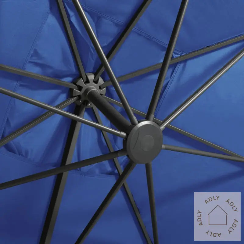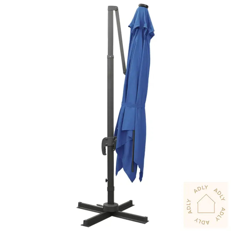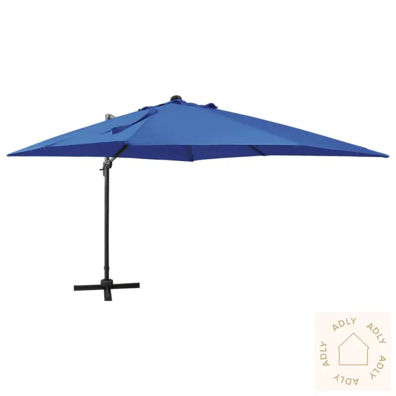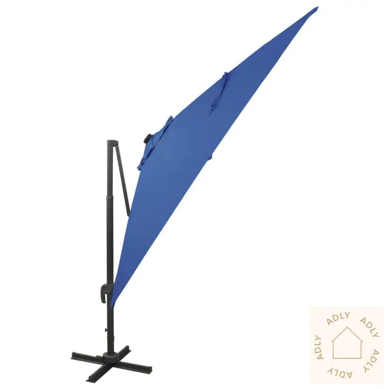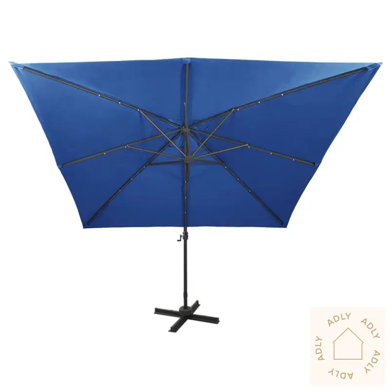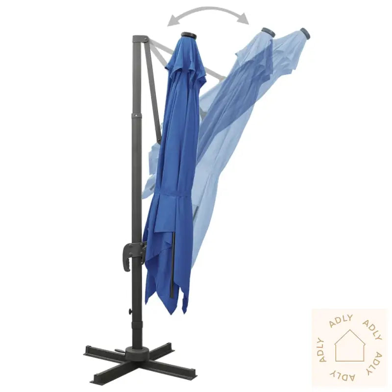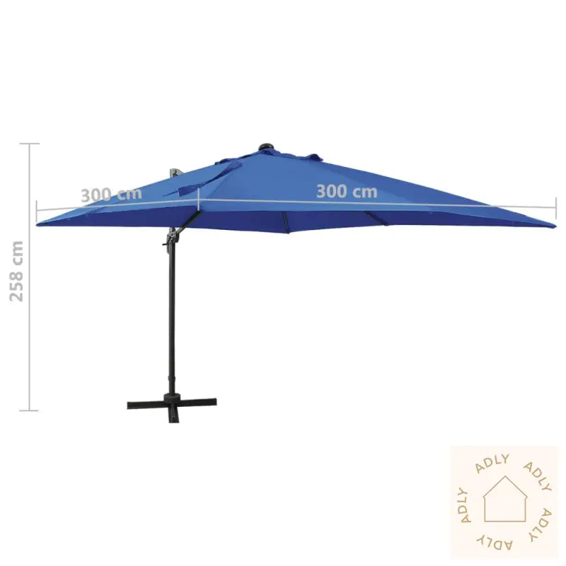 Farge: asurblåMaterialer: stoff med PA-belegg, aluminiumSamlet mål: 300 x 300 x 258 cm (L x B x H)Mål kryssfot: 100 x 100 cm (L x B)Med luftventil og sveivesystemVippbar og 360-graders roterende designInkluderer 8 aluminiumsspilerInkluderer 24 LED-lysMontering kreves: ja