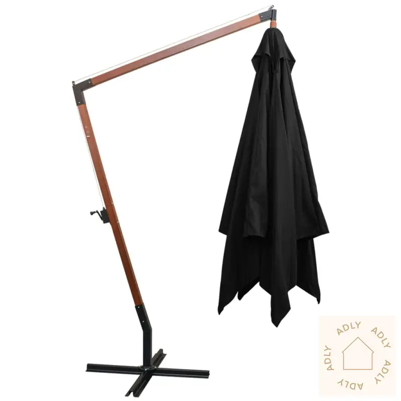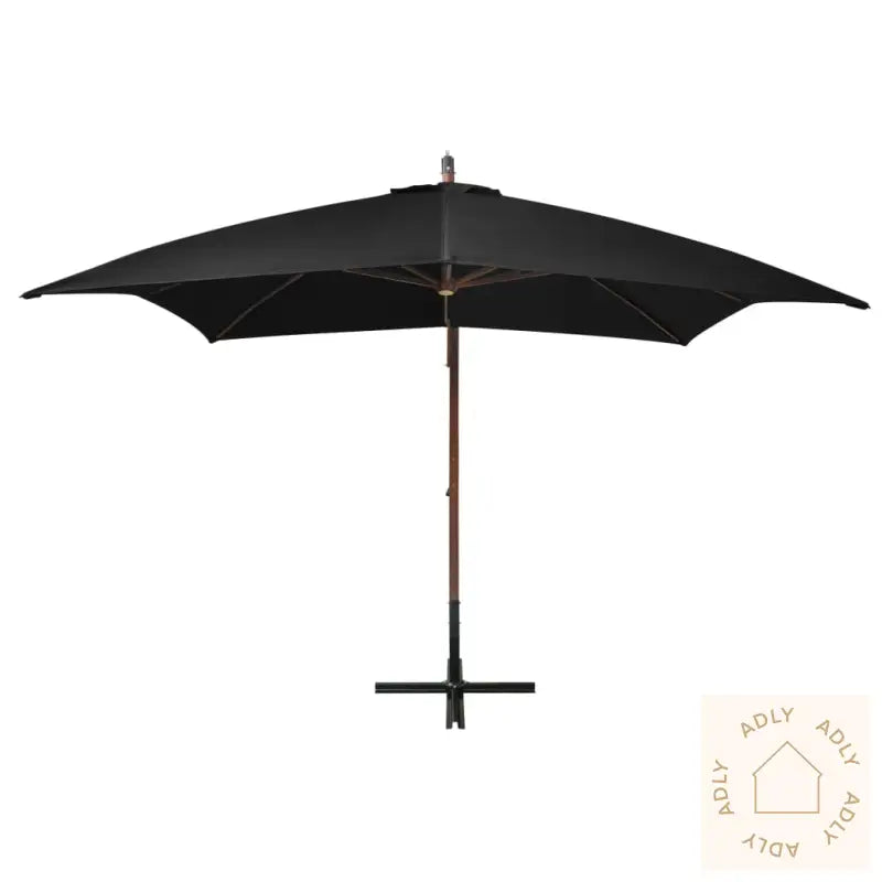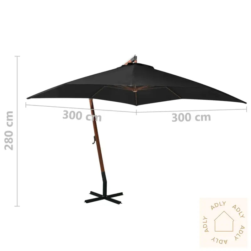 Farge: svartMaterialer stolpe: heltre gran, bambusMateriale trekk: 100% polyesterMateriale kryssfot: jernMål: 300 x 300 cm (L x B) Total høyde: 280 cmTykkelse stolpe: 55 mmMål kryssfot: 100 x 100 cm (L x B)Vanntett, UV-bestandig og fargetett dukMontering kreves: ja