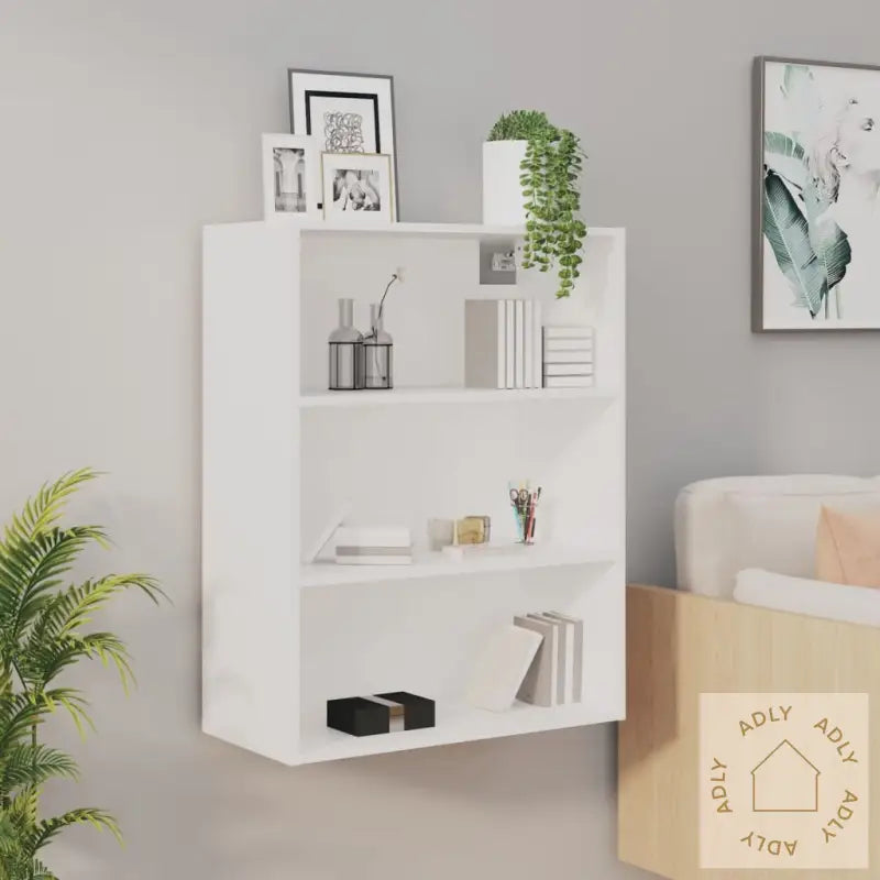 Sterkt materiale: Skapet er laget av slitesterkt, konstruert tre i høy kvalitet med en glatt, moderne overflate. Materialet gir stabilitet, styrke og lang levetid, samt god motstandsdyktighet mot fuktighet – ideelt for ethvert rom i huset. Det er også enkelt å holde rent.God lagringsplass: Med tre separate rom kan du strukturere og organisere dine eiendeler, enten det er bøker, dekorative gjenstander eller andre nødvendigheter. Nok plass til å samle det du trenger mest lett tilgjengelig på ett sted.Smart veggmontering: Ved å montere skapet på veggen får du mer gulvplass, noe som gir rommet et ryddigere uttrykk og større bevegelsesfrihet. Dette er spesielt praktisk i små leiligheter eller trange rom hvor plassen må utnyttes maksimalt.Perfekt for utstilling: Den solide toppen fungerer glimrende som en hylle til dekorasjoner som bilderammer, potteplanter eller ulike pyntegjenstander, slik at du kan sette et personlig preg på omgivelsene dine. Velg dekor etter sesong, og skap din egen stil med disse møblene.Merk: