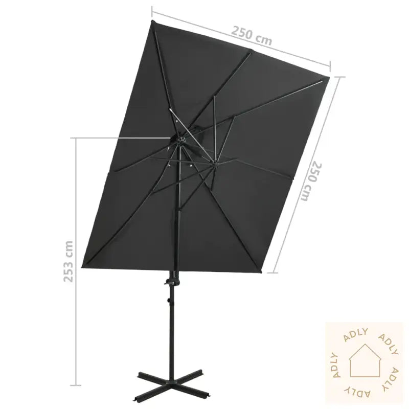 Farge skjerm: antrasittMaterialer: stoff med PA-belegg, aluminiumSamlet mål: 250 x 250 x 253 cm (L x B x H)Mål kryssfot: 100 x 100 cm (L x B)Med lufteventil og sveivesystemVippbar og 360-graders roterende designInkluderer 8 aluminiumsspilerMed dobbel toppMontering kreves: ja