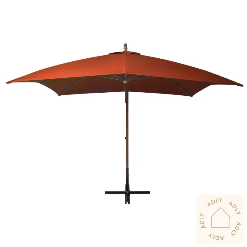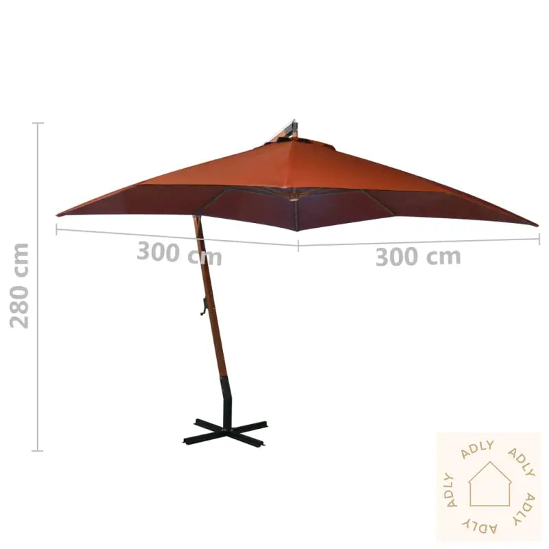 Farge: terrakottaMaterialer stolpe: heltre gran, bambusMateriale trekk: 100% polyesterMateriale kryssfot: jernMål: 300 x 300 cm (L x B) Total høyde: 280 cmTykkelse stolpe: 55 mmMål kryssfot: 100 x 100 cm (L x B)Vanntett, UV-bestandig og fargetett dukMontering kreves: ja