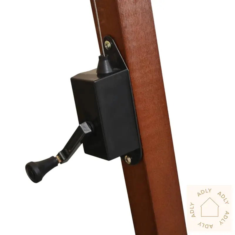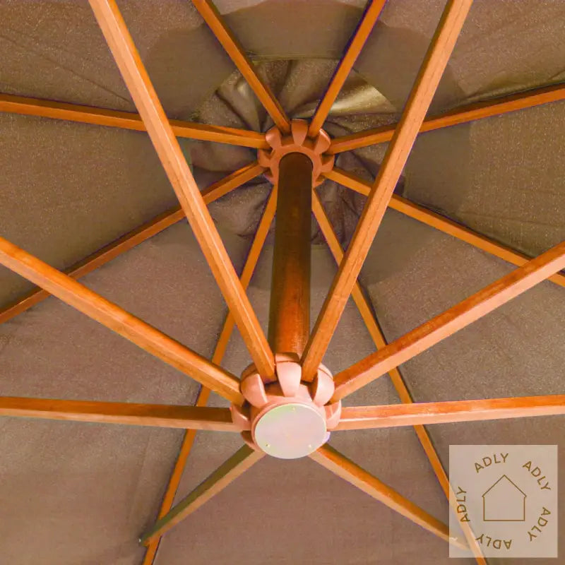Parasolltrekket er sydd i solid, UV-bestandig polyester som holder godt på fargen og gir effektiv skjerming mot solen, samtidig som det tåler vann og vær. Den kraftige stangen i heltre gran, kombinert med 8 sterke bambusribber og en stødig kryssfot i jern, sørger for varig stabilitet og lang levetid. Siden baldakinen henger fritt fra stolpen, slipper du å få den i veien – alt gulvarealet under er tilgjengelig til møbler og bruk.
