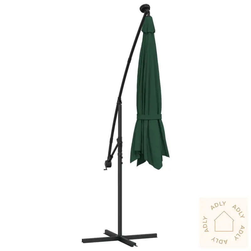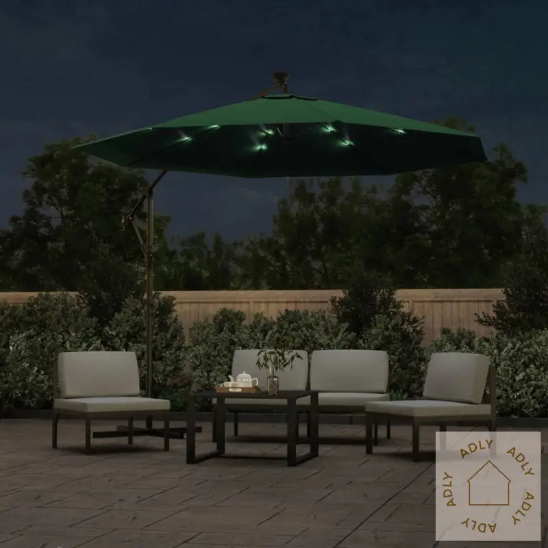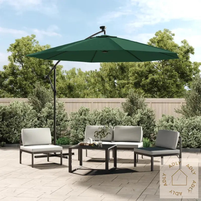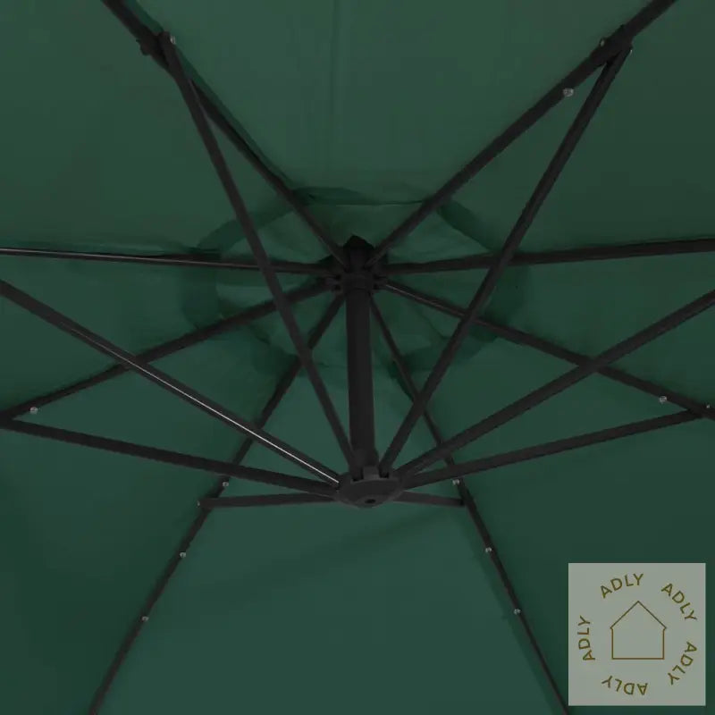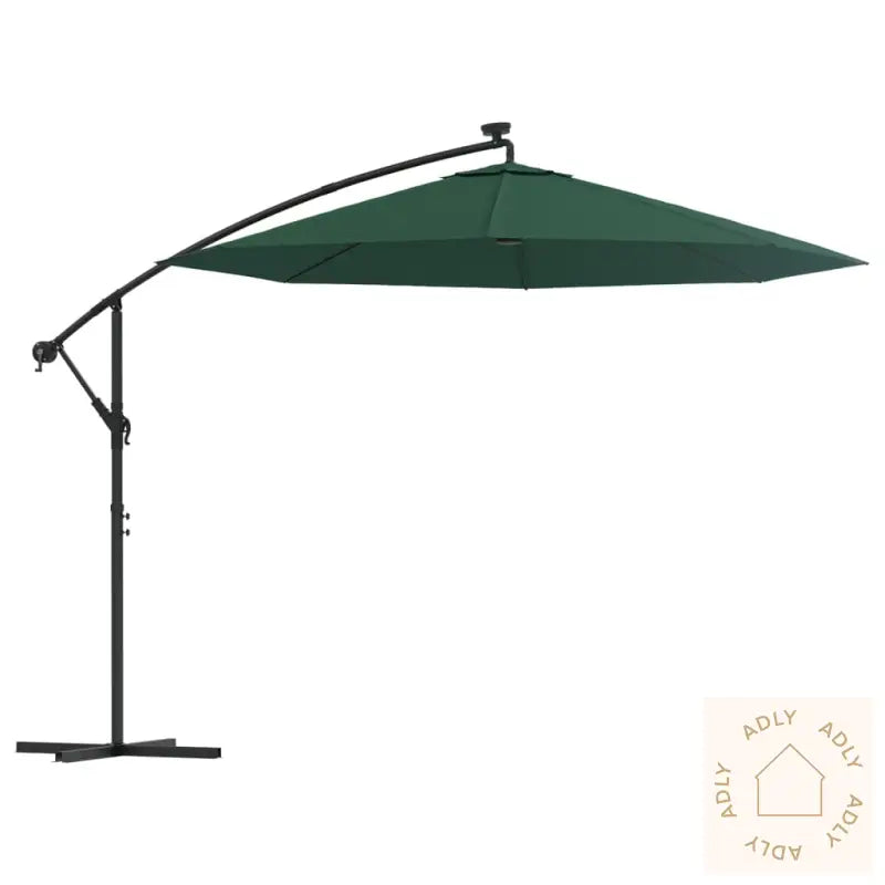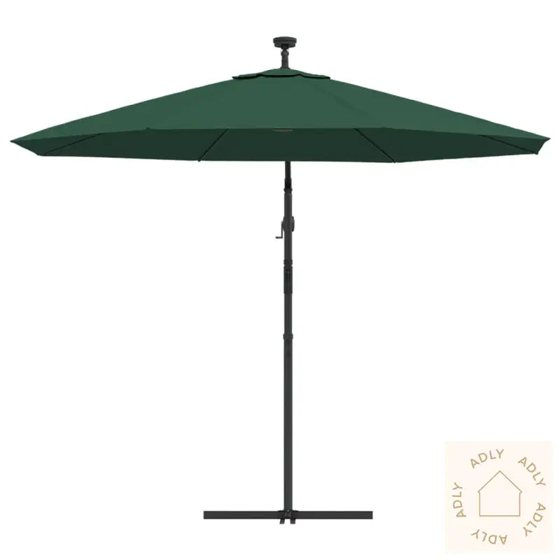Farge: grønnSkjermmateriale: Stoff (vanntett, UV-bestandig og farget)Rammemateriale: Metallstang og 8 ribberSkjermdiameter: 300 cmTotal høyde: 254 cmMål kryssfot: 100 x 100 cm (L x B)Med luftventil og sveivemekanismeInkluderer 24 LED-lys og 1 solpanelLadetid for solpanel: ca. 8 timer på solrike dagerLysdiodenes driftstid: ca. 4 timerSolpanelets effekt: 0,7 WEnkel monteringStoff: 100 % polyester