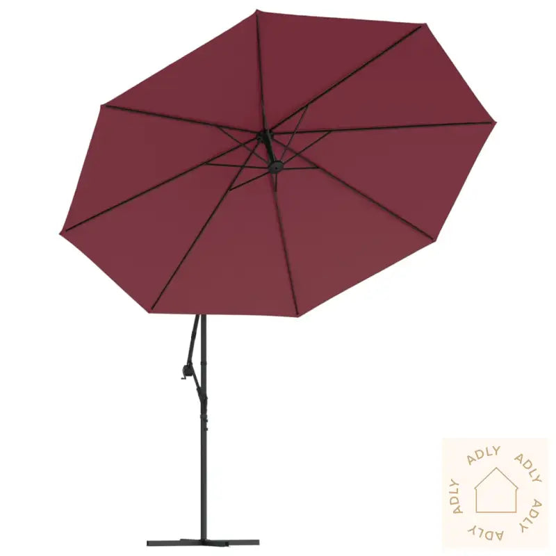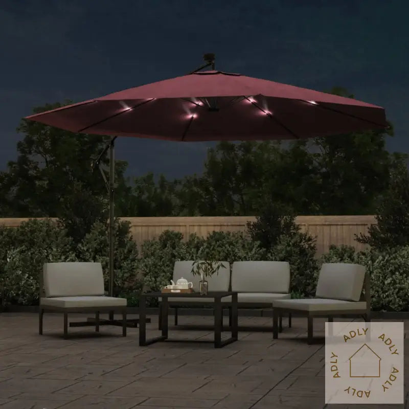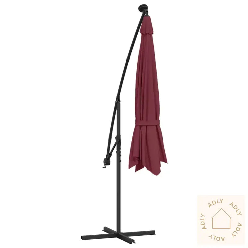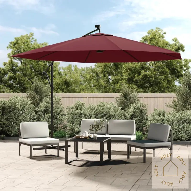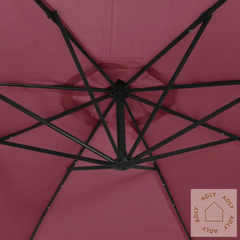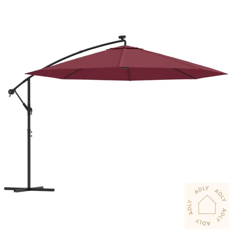 Farge skjerm: vinrødMaterialer: stoff, metallSamlet mål: 350 x 290 cm (diameter x H)Mål kryssfot: 100 x 100 cm (L x B)Inkluderer 24 LED-lys og 1 solpanelEffekt solpanel: 0,7 WMed luftventil og sveivemekanismeMed 8 stålspiler