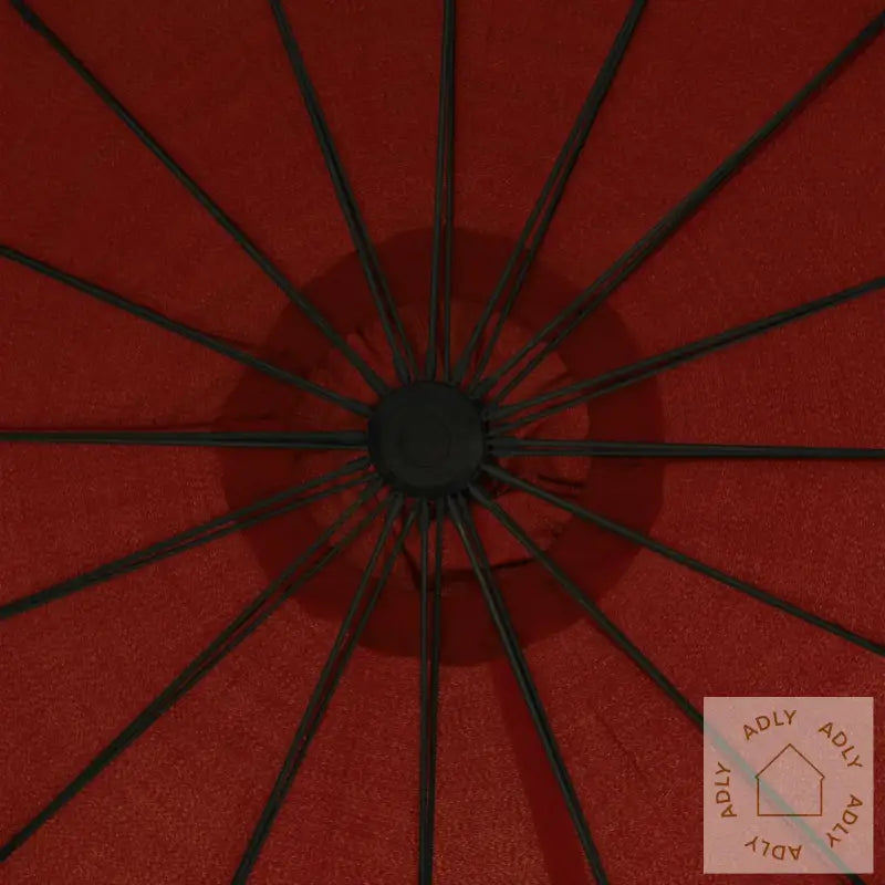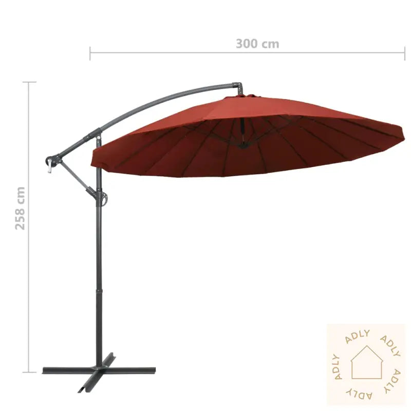 Farge: terrakottaMaterialer: aluminium, stoff (100% polyester)Mål: 3 x 2,58 m (Diameter x H)Mål kryssfot: 100 x 100 cm (L x B)Diameter stang: 48 mm16 spilerSveivesystemMontering kreves: ja