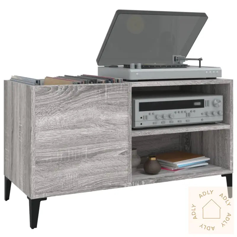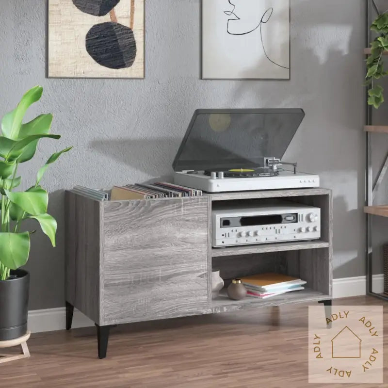 Slitesterkt materiale: Det konstruerte treverket har en jevn finish og tilbyr både styrke og god motstand mot fuktighet. Denne kvaliteten gir deg et solid møbel som varer, og passer godt inn med andre bokhyller og stående hyller.Rikelig lagringsplass: Det store skapet gir masse plass til LP-samlingen din, slik at platene dine alltid er lett tilgjengelige og pent organisert. Du får enkelt plass til flerfoldige plater eller annet hi-fi tilbehør.Solid topp: Den robuste toppen gjør det ideelt å sette platespilleren din frem for enkel tilgang når du vil høre på musikk, men det er også plass til dekor, høyttalere eller annen småelektronikk.Flere funksjoner: Hifi-benken er like fin som sideskap i stua eller på kontoret, perfekt til oppbevaring av bøker, blader eller dokumenter. På den måten får du maksimalt ut av møbelet – både som vinyloppbevaring og som del av hjemmets øvrige møblering.Metallben: De stilrene metallføttene gir benken en moderne, industriell touch som tilfører rommet karakter. Samtidig sikrer de stabilitet og gir møbelet god støtte.Farge: Grå SonomaMaterialer: Konstruert treverk og metallMål: 84,5 x 38 x 48 cm (B x D x H)Montering kreves: Ja