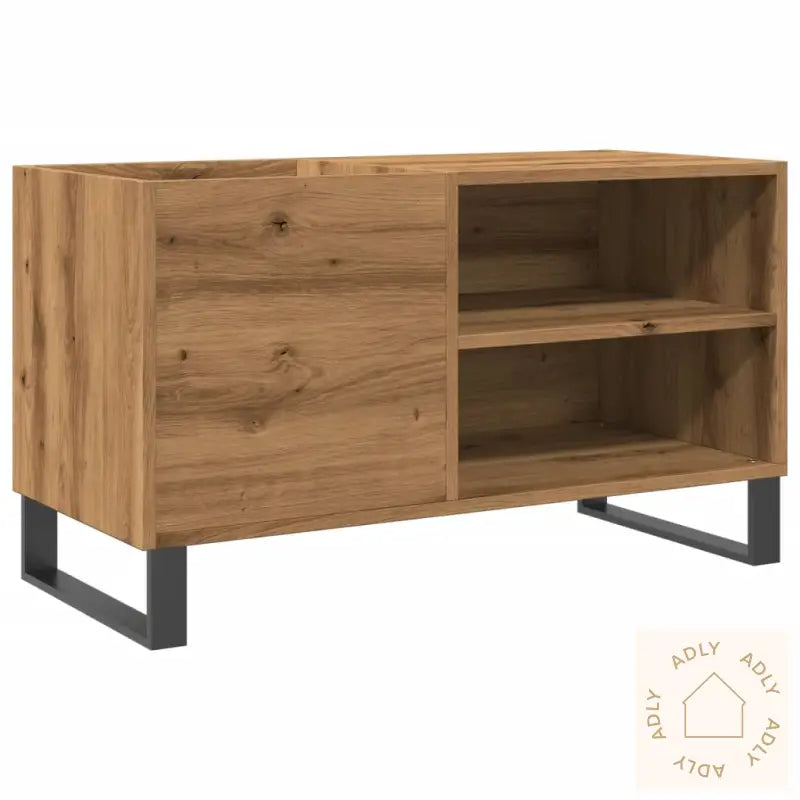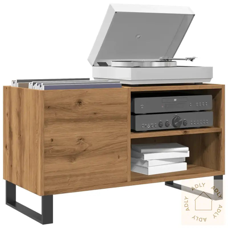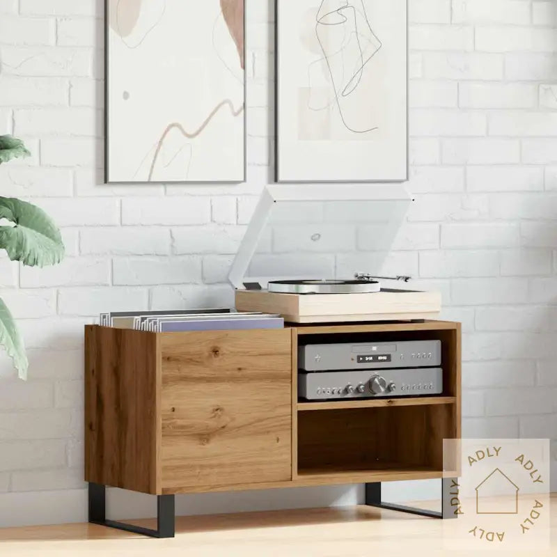 Stabilt og slitesterkt materiale: Den er laget av konstruert tre – kjent for sin styrke og jevne finish. Dette materialet motstår fuktighet, holder formen lenge og tåler daglig bruk, noe som gjør benken til et smart valg hvis du ser etter solide møbler som varer.Rikelig lagringsplass: Det store skapet gir god plass til LP-plater og annet musikkutstyr, så du får orden på musikksamlingen og enkelt tilgang til favorittplatene dine.Solid topp: Toppen av hifi-benken er robust nok til å holde platespilleren din, samt annen elektronikk eller pyntegjenstander, slik at alt er samlet på ett sted.Jernføtter: Med ben av jern får benken et kult, industrielt preg og står stabilt på gulvet – perfekt dersom du liker moderne vri på klassiske møbler.Farge: artisan eikMateriale: konstruert treMål: 84,5 x 38 x 48 cm (B x D x H)Maks vektkapasitet (totalt): 60 kgMontering kreves: ja