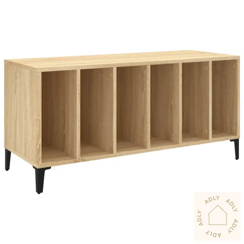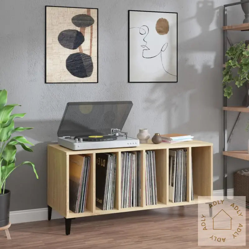 Slitesterkt materiale: Skapet er laget av konstruert treverk av høy kvalitet med glatt finish. Dette gir deg solide og stabile møbler til hjemmet, samtidig som materialet tåler både daglig bruk og fuktighet over tid.Rikelig lagringsplass: Her får du god plass til LP-plater og tilbehør, slik at musikksamlingen din holder seg ryddig og lett tilgjengelig. Perfekt for deg som liker å holde orden.Solid topp: Den robuste topplaten gir plass til platespiller, høyttaler eller andre elektroniske apparater – alt du trenger for en komplett hifi-opplevelse hjemme.Flere funksjoner: Benken i sonoma eik er allsidig – bruk den som TV-benk, sideskap i stua eller som ekstra arkivskap på kontoret. Kombinasjonen av stil og funksjonalitet passer både for dem som setter pris på moderne møbler til hjemmet og de som ønsker praktiske utendørsmøbler.Metallben: De sterke metallføttene gir skapet en moderne, industriell vri og sørger for maksimal stabilitet. Samtidig gir de et eksklusivt uttrykk som passer inn i de fleste interiørstiler.Farge: Sonoma eikMaterialer: Konstruert tre, metallMål: 100 x 38 x 48 cm (B x D x H)Montering kreves: Ja