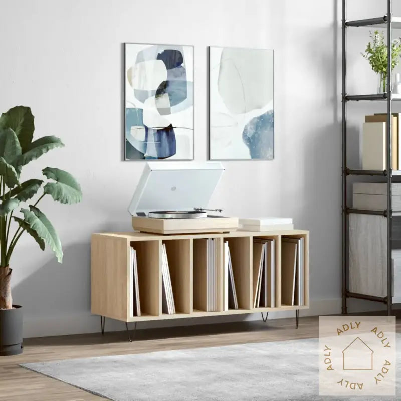 Oppbevar og vis fram vinylplatene dine på en elegant måte med denne praktiske og tidløse hifi-benken i sonoma eik, perfekt som et stilig tilskudd til møbler til hjemmet.