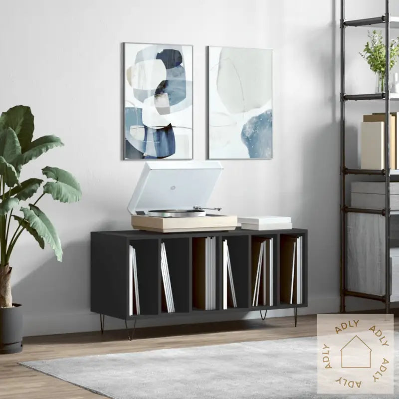 Slitesterkt materiale: Det konstruerte treverket har førsteklasses kvalitet, en jevn, pen overflate og er designet for å være robust, stabilt og motstandsdyktig mot fukt – noe som gir deg langvarig glede av møbelet.Rikelig lagringsplass: Det romslige skapet lar deg oppbevare LP-plater og andre musikkrelaterte gjenstander samlet og oversiktlig, slik at du alltid finner fram til dine favoritter uten rot.Solid topp: Den stabile toppen gir deg god plass til platespiller, høyttalere eller andre elektroniske enheter – samtidig som det skaper en flott visuell sone for musikkinspirerte interiørløsninger.Jernføtter: Med elegante jernføtter får benken et industrielt, moderne utseende, samtidig som den står stødig og sikkert uansett hvor du plasserer den i hjemmet.Farge: svartMaterialer: konstruert tre, jernSamlet mål: 100 x 38 x 48 cm (B x D x H)Høyde fot: 10 cmMontering kreves: ja