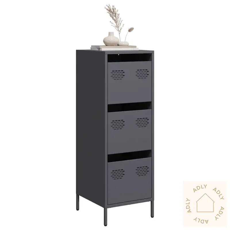 Robust og stabil struktur: Laget av kaldvalset stål, får du en overflate som er ekstra jevn og solid, noe som gir hele møbelet høy styrke og presisjon. De elegante metallføttene understreker stilen og sørger for at skapet står stødig, perfekt for deg som vil ha tidløse og pålitelige møbler til hjemmet.Rikelig med oppbevaringsplass: Skapet har tre romslige skuffer slik at du enkelt kan holde orden på det du måtte ønske – alt fra papirer, dekorting, bøker og småting. Det gjør det enkelt å holde stuen, soverommet eller kontoret ryddig, samtidig som alt er lett tilgjengelig.Enkelt å vedlikeholde: Overflaten i kaldvalset stål er glatt og lett å holde ren. Bare tørk av med en fuktig klut ved behov, så holder både hyller og skuffer seg pene med minimalt vedlikehold.Allsidig bruk: Dette highboardet passer like godt som bokhylle eller utstillingshylle i ulike rom. Enten du trenger ekstra plass til bøker og pynt, eller ønsker oppbevaring på kontoret, tilpasser møbelet seg enkelt etter dine behov og glir naturlig inn blant andre bokhyller og stående hyller.Advarsel:
