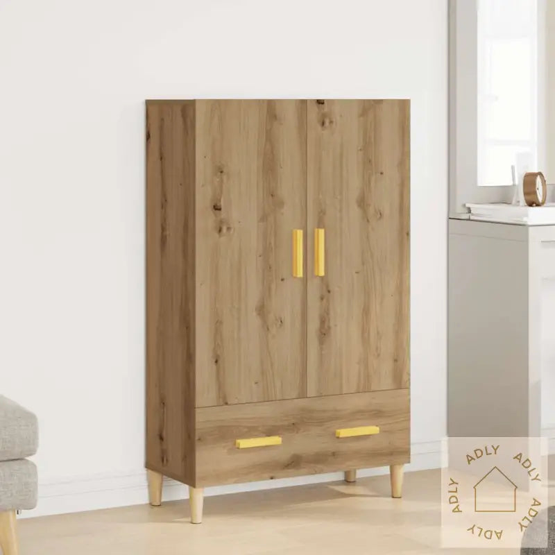 Solid materiale: Skapet er laget av konstruert treverk, kjent for sin høye kvalitet og glatte overflate. Materialet er ikke bare robust og slitesterkt, men også motstandsdyktig mot fukt – ideelt for norske hjem.Rikelig med lagringsplass: Med to praktiske dører og én romslig skuff gir dette skapet god plass til å organisere alt fra servise og bøker til småting du vil ha lett tilgjengelig. Hold daglige nødvendigheter pent samlet bak lukkede fronter.Praktiske dører: Med tette dører beskytter du enkelt innholdet mot støv og holder alt ryddig uten at det vises frem. Perfekt for deg som liker et rent uttrykk på oppbevaringsmøbler.Robust topp: Toppen gir deg rom til å vise frem dine favorittbilder, planter eller dekor — skap en personlig stil ved å kombinere highboardet med andre hagemøbler eller bokhyller i artisan eik for et helhetlig preg.Metallføtter: De stilrene metallføttene gir både et stabilt fundament og et moderne, sofistikert preg til interiøret.Advarsel:
