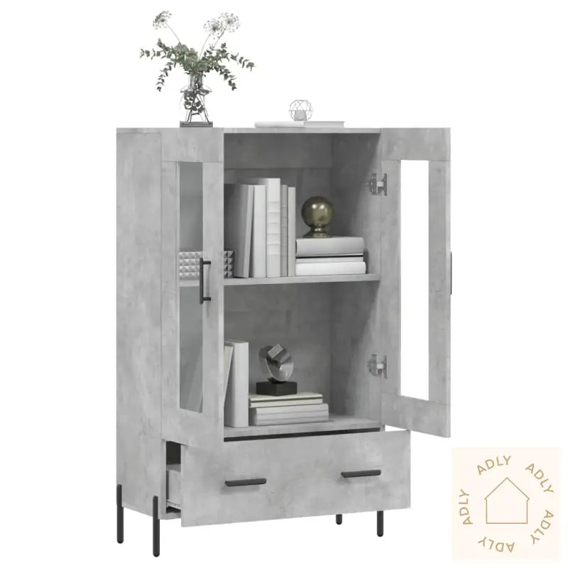 For å sikre best mulig stabilitet og forhindre at highboardet velter, må produktet festes i veggen med den medfølgende festeanordningen.Farge: betonggråMaterialer: konstruert tre, metall, glassSamlet mål: 69,5 x 31 x 115 cm (B x D x H)Montering kreves: jaLegal Documents: