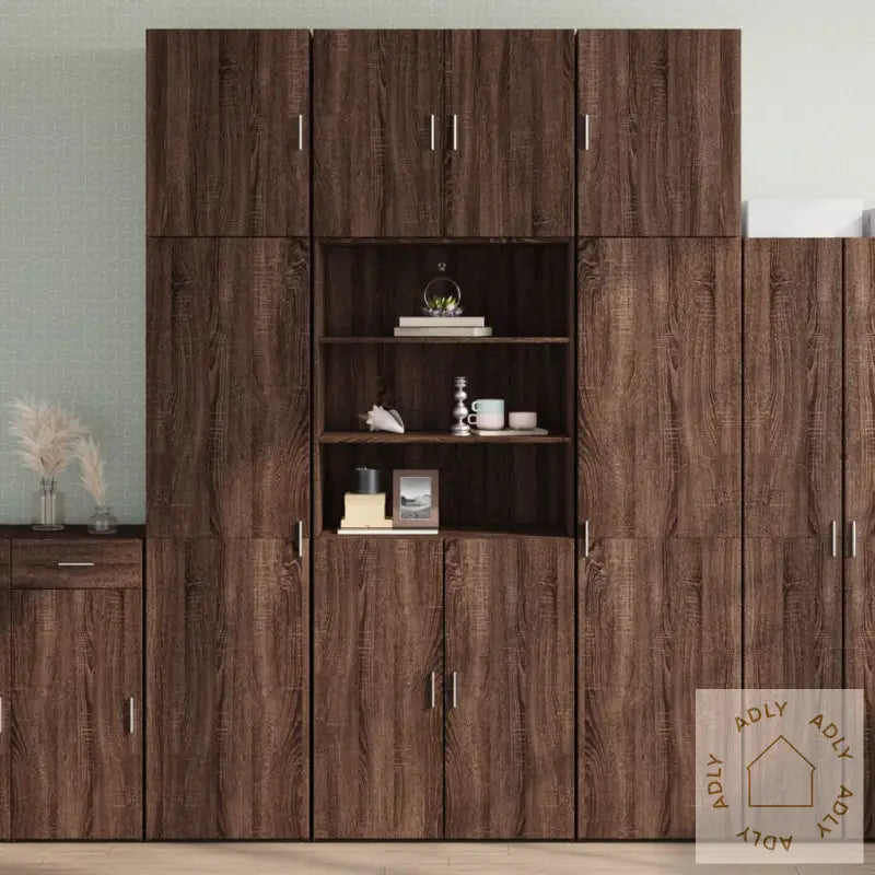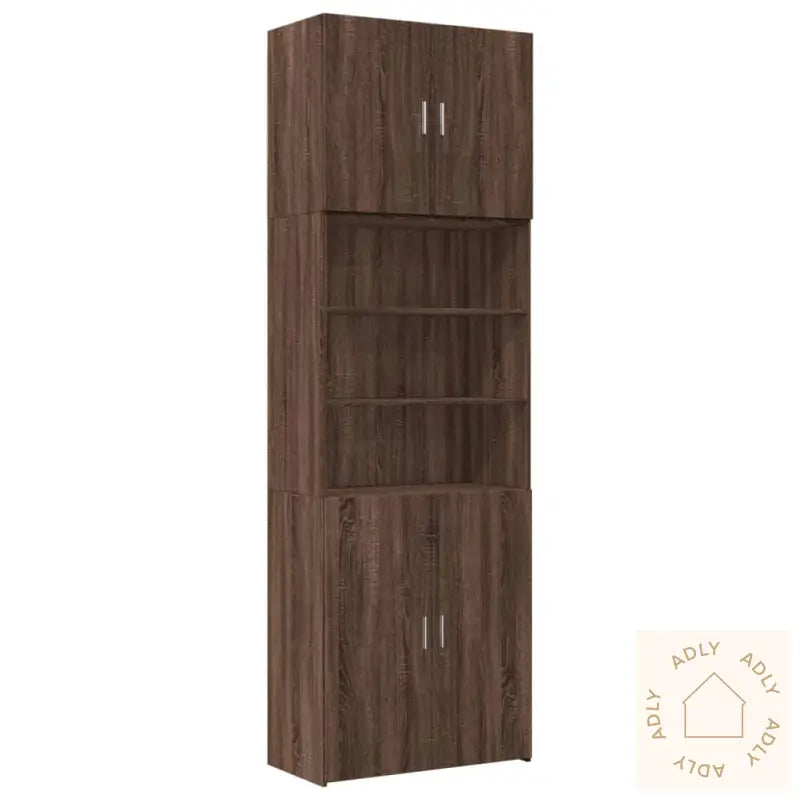 Holdbart materiale: Highboardet er laget av konstruert tre av høy kvalitet. Det har en glatt overflate som gir et eksklusivt uttrykk og gjør møbelet robust, stabilt og motstandsdyktig mot fuktighet – perfekt for norske forhold.Enkelt i bruk: De praktiske håndtakene gjør det smidig å åpne og lukke skapdørene. Samtidig gir detaljene ekstra visuell interesse og hever stilen på møblet.Rikelig oppbevaringsplass: Med både åpne hyller og lukkede skap får du god plass til å organisere gjenstander som bøker, servise, dekor eller andre viktige ting. Dette gir deg oversikt, ryddighet og alt du trenger lett tilgjengelig.Enkel vedlikehold: Den glatte overflaten gjør det enkelt å holde møbelet rent. Bare tørk over med en fuktig klut – superpraktisk i en travel hverdag, med minimalt behov for vedlikehold.Allsidig bruk: Dette highboardet med brun eik-finish passer inn i både stue, soverom, gang, kontor eller til og med garasjen – et smart valg uansett hvor i huset du trenger ekstra oppbevaring.Advarsel:
