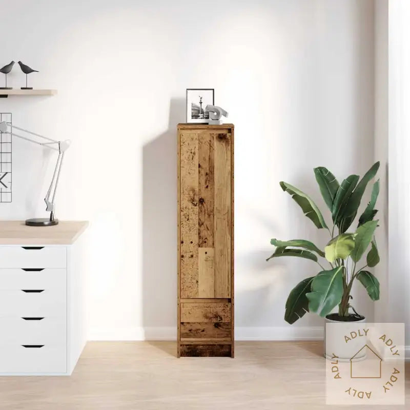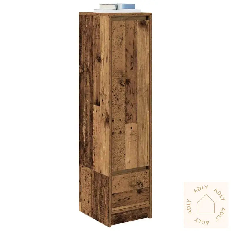 Farge: Gammelt treMateriale: Konstruert treSamlet mål: 29,5 x 34 x 119,5 cm (B x D x H)Skuffedimensjoner: 26 x 28,5 x 19,5 cm (B x D x H)Antall dører: 1Antall skuffer: 1Antall hyller: 2Maks. vektkapasitet totalt: 60 kgMaks. vektkapasitet per hylle: 20 kgMaks. vektkapasitet for skuffen: 5 kgMontering kreves: Ja