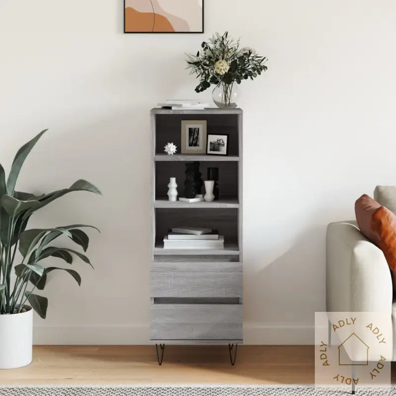 Rikelig med lagringsplass: Highboardet har 3 åpne hyller og 2 romslige skuffer, så du har masse plass til å organisere alt fra bøker og servise til småting du vil ha lett tilgjengelig. Perfekt for å holde orden i stua, gangen eller på kontoret.