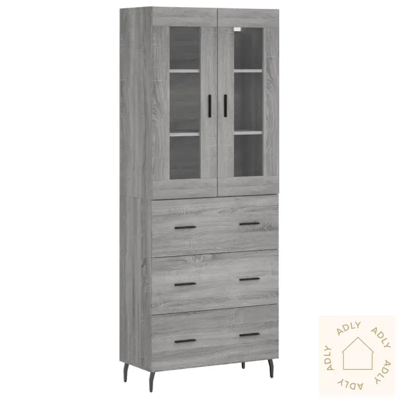 Skruer og plugger til veggmontering følger ikke med. Velg skruer og plugger som passer din veggtype – spør en profesjonell hvis du er usikker, og følg alltid monteringsanvisningen nøye.Farge: grå sonomaMaterialer: konstruert tre, glass og metallMål samlet: 69,5 x 34 x 180 cm (B x D x H)Mål skjenk: 69,5 x 34 x 90 cm (B x D x H)Mål toppdel til highboard: 69,5 x 34 x 90 cm (B x D x H)Montering krevesLeveransen inneholder:1 x skjenk1 x topp for highboardLegal Documents: