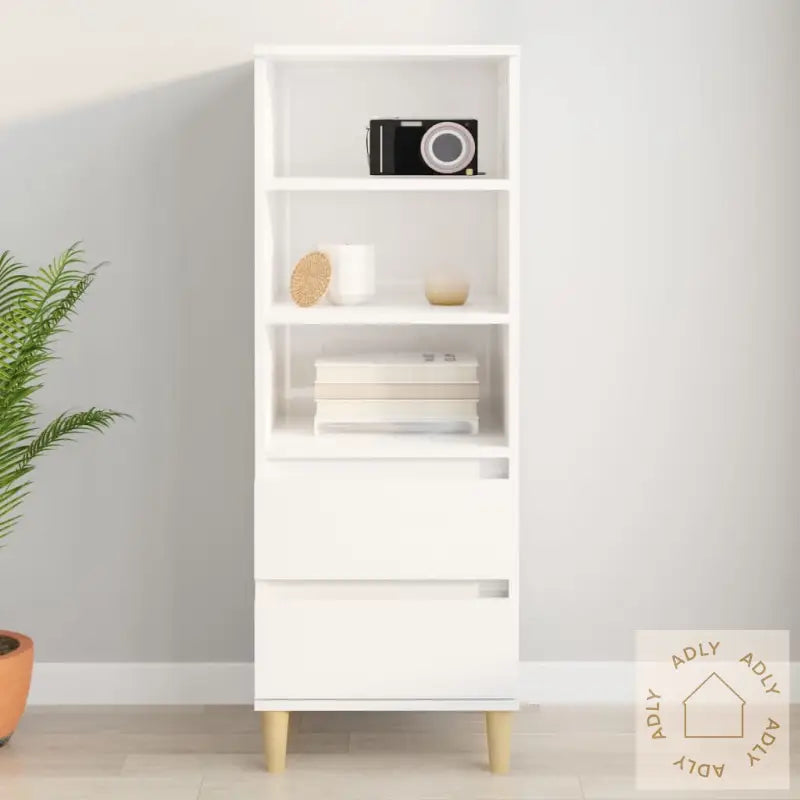Slitesterkt materiale: Skjenken er laget av konstruert treverk som gir et elegant uttrykk og langvarig holdbarhet. Konstruert tre har ikke bare en jevn og glatt overflate, men er også kjent for sin styrke, stabilitet og gode motstand mot fuktighet, noe som gjør dette møbelet velegnet til både stue og andre rom i hjemmet.Stabile treføtter: Hele skapet hviler trygt på solide ben i heltre eukalyptus, noe som gir et varmt og naturlig preg. De robuste føttene sørger for ekstra stabilitet samtidig som de passer inn med mange ulike stiler innenfor møbler og moderne interiør.Rikelig med oppbevaringsplass: Praktisk design med tre åpne hyller og to skuffer gir deg godt med plass til å sortere og oppbevare alt fra bøker og dekorgjenstander til småting du vil ha lett tilgjengelig. Det gjør denne skjenken ideell som bokhylle eller for smart oppbevaring av dagligdagse nødvendigheter.Robust topp: Den stabile toppen inviterer til å vise frem favorittbildene dine, grønne planter eller personlige pynteobjekter. Dette gjør at du enkelt kan sette et personlig preg på rommet og gjøre skapet til en del av din helhetlige innredning med andre møbler til hjemmet.Advarsel: