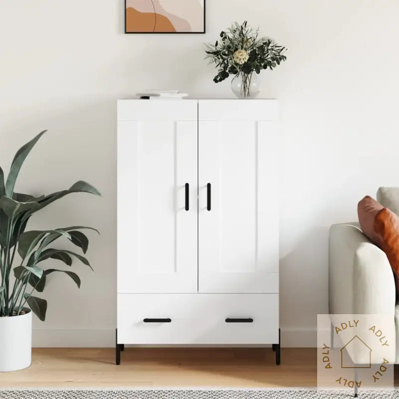 Slitesterkt materiale: Highboardet er laget av konstruert tre av høy kvalitet, som gir en jevn og fin overflate. Dette solide materialet sørger for både styrke, stabilitet og god motstandsdyktighet mot fukt – noe som gjør at du får et møbel som varer lenge.Rikelig med lagringsplass: Få orden på tingene dine! Skjenken har praktisk og romslig oppbevaringsplass, slik at du enkelt kan organisere alt fra servise og bøker til småting du vil ha lett tilgjengelig. Perfekt enten du skal fylle på med flere møbler eller ønsker en smart løsning sammen med andre bokhyller og stående hyller.Visningsfunksjon: På toppen av skapet kan du stille ut favorittdekorasjoner, bilder eller friske blomster. Dette gjør det enkelt å sette et personlig preg på rommet samtidig som møbelet fremhever interiøret ditt.Advarsel: