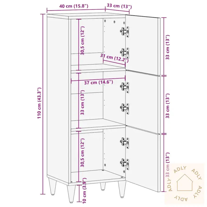 For ekstra sikkerhet og for å forhindre at skapet velter, må det festes til veggen med de medfølgende beslagene.Farge: svartMateriale: Massivt mangotre med lys grå finish, konstruert treMål: 40 x 33 x 110 cm (L x B x H)Med 3 romMontering kreves: ja