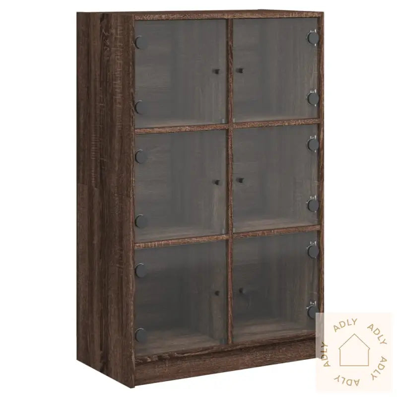 For din sikkerhet må produktet festes med den medfølgende festeanordningen for å forhindre at det velter.Farge: brun eikMaterialer: konstruert tre, glassMål: 68 x 37 x 109 cm (B x D x H)Mål rom: 32 x 37 x 32 cm (B x D x H)Antall rom: 6Montering kreves: ja