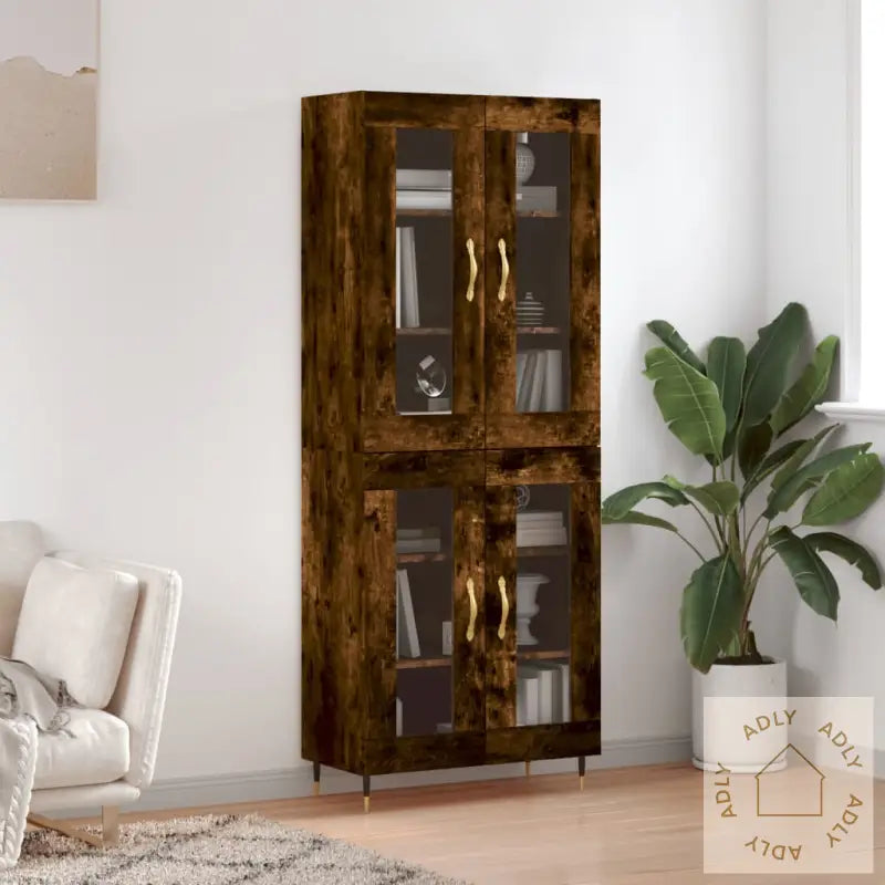 Skruer og plugger for veggmontering følger ikke med, så husk å velge festemateriell som passer til akkurat dine vegger. Er du usikker, spør gjerne en fagperson. Følg instruksjonene nøye for trygg montering.Farge: røkt eikMaterialer: konstruert tre, glass, metallSamlet mål: 69,5 x 34 x 180 cm (B x D x H)Mål skjenk: 69,5 x 34 x 90 cm (B x D x H)Mål topp for highboard: 69,5 x 34 x 90 cm (B x D x H)Montering kreves: jaLeveransen inneholder:1 x skjenk1 x topp for highboardLegal Documents: