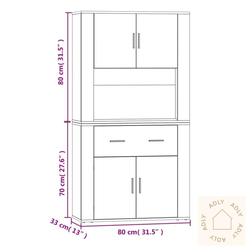 Slitesterkt og pålitelig materiale: Highboardet er laget av konstruert tre av høy kvalitet, kjent for sin glatte overflate. Dette gir utmerket styrke, stabilitet og god motstand mot fuktighet – egenskaper som sikrer at møbelet varer lenge, selv i aktive hjem.Masse oppbevaringsplass: Skjenken har godt med lagringsplass til å holde orden på alt fra servise, dokumenter, bøker eller andre nødvendigheter. Her er det enkelt å skape et organisert hjem, hvor daglige ting alltid er tilgjengelige og pent ryddet bort.Smart veggmontering: Oppbevaringsskapet kan enkelt festes på toppen av skjenken og monteres på veggen, slik at du får et komplett highboard. Dette sparer gulvplass – perfekt for mindre rom eller moderne hjem der smarte løsninger gjør stor forskjell. Highboardet gjør det mulig å maksimere tilgjengelig plass og holder rommet ryddig.Godt å vite: