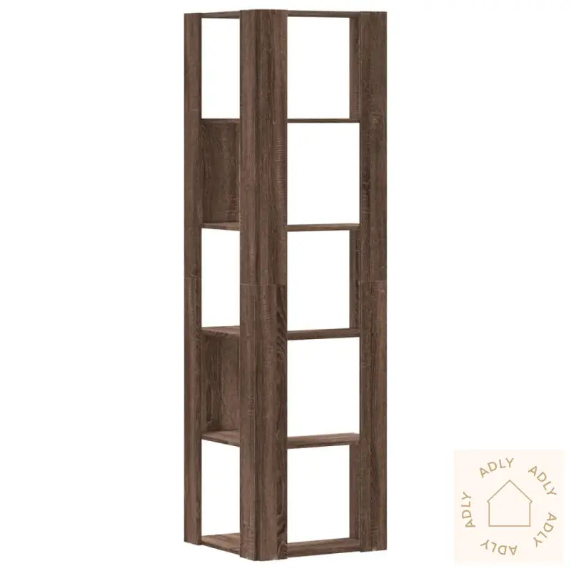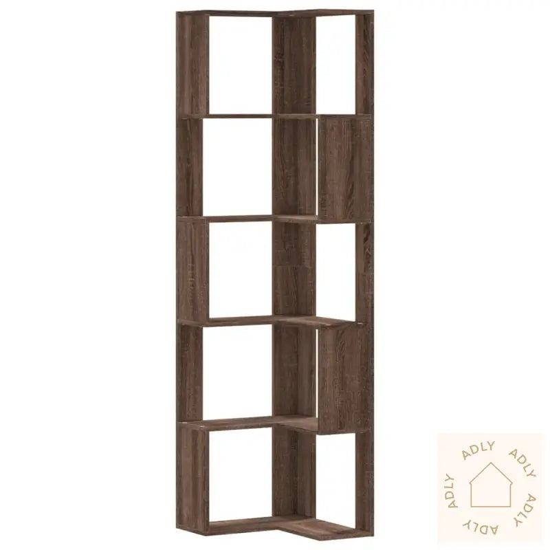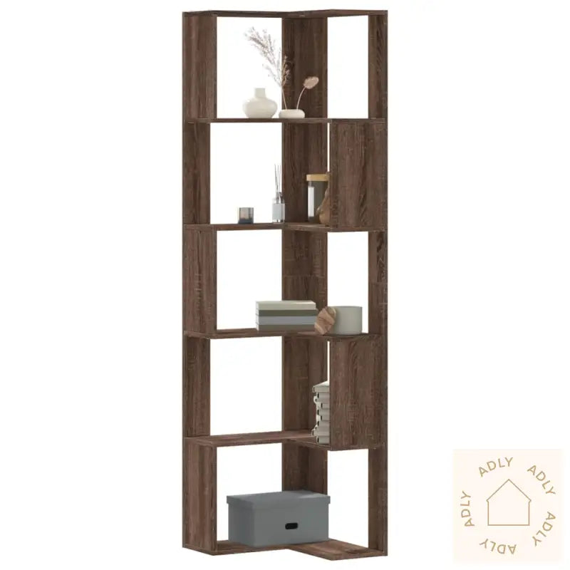 Denne bokhyllen for hjørnet gir en stilig og smart løsning for å vise frem dine favorittgjenstander samtidig som alt holdes ryddig og lett tilgjengelig. Med sitt elegante design i brun eik passer den perfekt inn i de fleste hjemmemiljøer, og gjør det enkelt å kombinere med andre møbler til hjemmet.