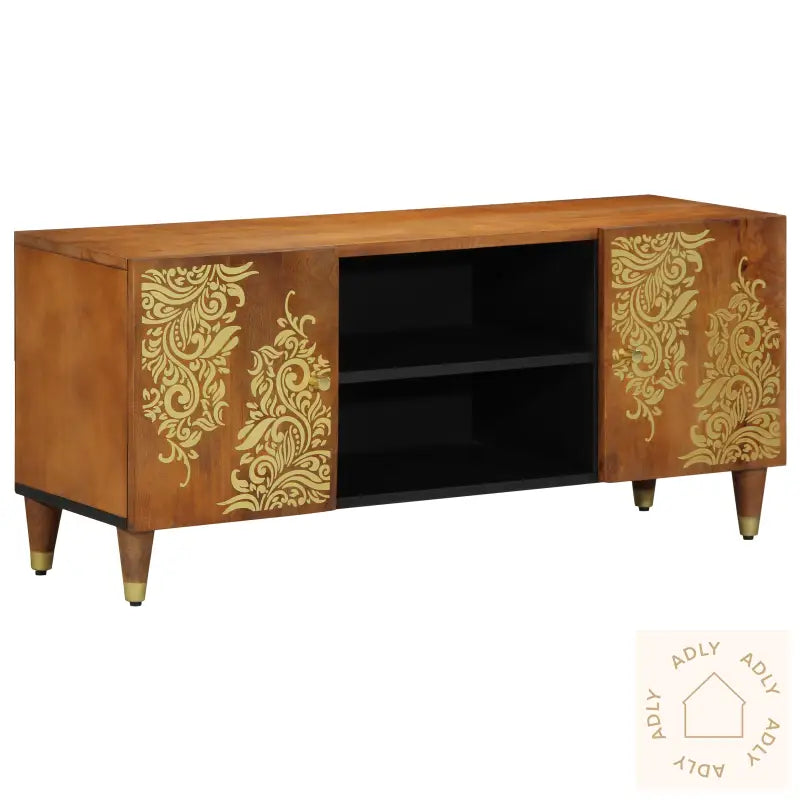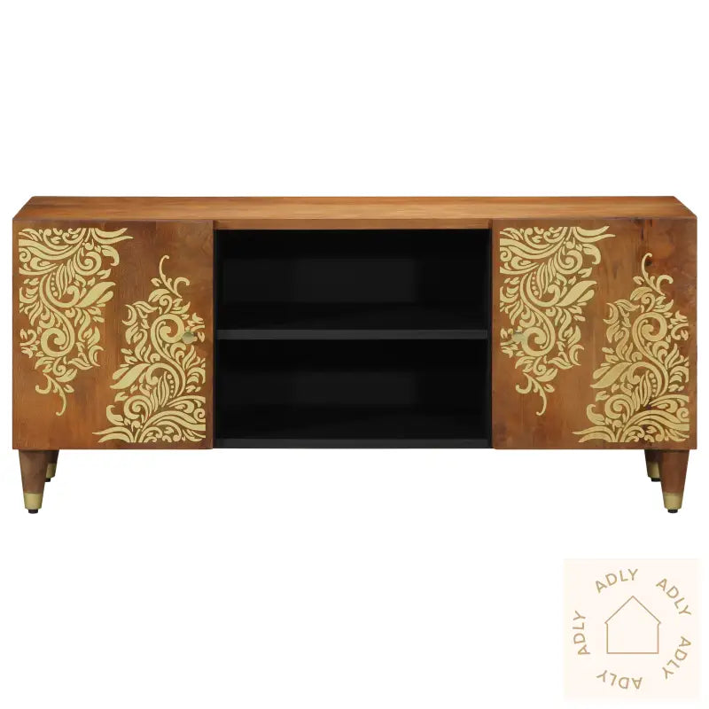 Smarte blomsterinnlegg: De detaljerte blomstermønstrene gjør dette skapet unikt. Med sin intrikate utforming gir innleggene en ekstra dimensjon og viser frem ekte håndverk, så skapet tar naturlig plass som et midtpunkt i interiøret og blir ofte lagt merke til av gjestene.Solid akasietre-konstruksjon: Skapet er laget av massivt akasietre som kan holde inntil 50 kg. Dette robuste materialet gir lang levetid og styrke, samtidig som den naturlige treoverflaten gir en varm og innbydende atmosfære til rommet. Akasietre er kjent for å tåle mye bruk uten å miste sitt fine utseende.Plassbesparende hyller: Innebygde hyller gir fleksibel oppbevaring og effektiv utnyttelse av plassen. Hyllene på 70 x 40 cm egner seg godt til alt fra bokhyller og stående hyller for bøker, elektronikk og dekorobjekter. Dette gjør at skapet passer inn både som mediemøbel og som praktisk lagringsplass blant øvrige møbler.Stilig oppbevaring: Med to hengslede dører får du enkel tilgang til innholdet, samtidig som det holder orden og gir en ryddig stil. De praktiske skyvedørene gjør daglig bruk smidig, og du kan enkelt bytte mellom å vise frem pyntegjenstander eller holde ting ute av syne for et renere uttrykk i stua.Enkel pleie: Skapet krever lite vedlikehold for å beholde dets vakre finish. Tørk det enkelt over med en myk klut – unngå sterke rengjøringsmidler – for å beholde det elegante utseendet i mange år. Dette gjør at skapet fortsatt fremstår som et sjarmerende møbel i hjemmet ditt år etter år.Farge: BrunMønster: BlomsterinnleggForm: RektangulærMateriale: Solid akasietreFinish: MattKun for innendørs brukAntall dører: 2Rom: StueMaksimal vekt: 50 kgHøyde overflate: 2 cmHøyde ben: 10 cmLeveransen inkluderer: 1 medieoppbevaringsskapMontering kreves, anbefalt 2 personer