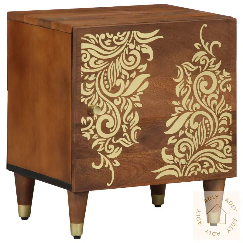Dette nattbordet i en varm honningbrun farge med lekre gullfargede detaljer tilfører soverommet en unik og sjarmerende atmosfære. Møbelet er laget av solid treverk og prydet med et dekorativt blomsterdesign på døren, noe som gir deg et praktisk møbel som også fungerer som et flott blikkfang. Enten du ser etter stilfulle møbler til hjemmet, eller ønsker å komplettere øvrige møbler som bokhyller og stående hyller, passer dette nattbordet perfekt inn sammen med diverse interiørstiler.