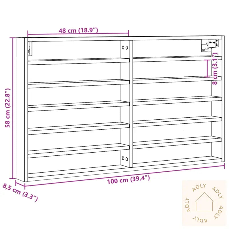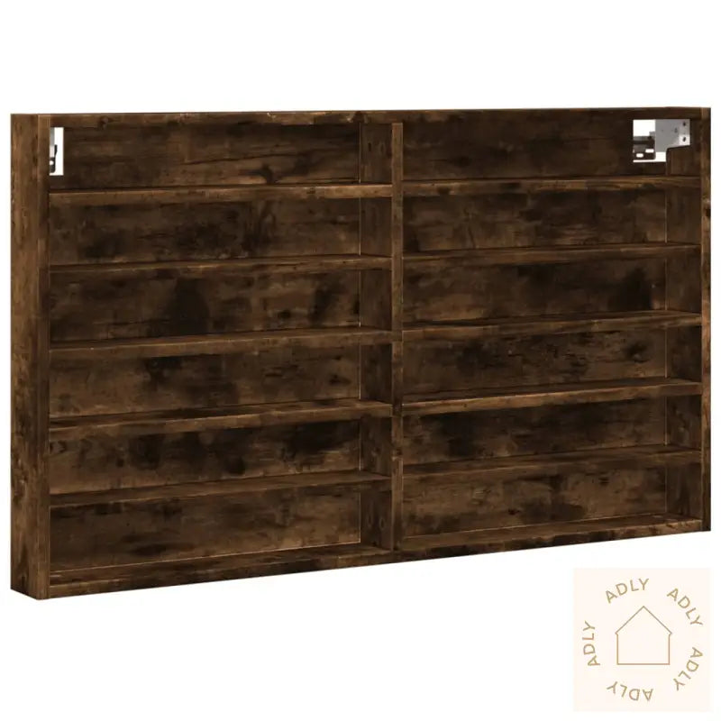 Farge: røkt eikMateriale: konstruert treMål: 100 x 8,5 x 58 cm (B x D x H)Lagringsplass: 12 hyllerMaksimal lastekapasitet (totalt): 60 kgMaksimal lastekapasitet (per hylle): 5 kgMontering kreves: ja
