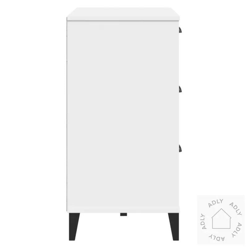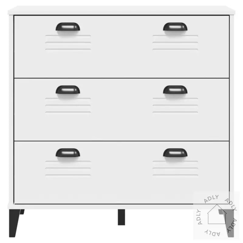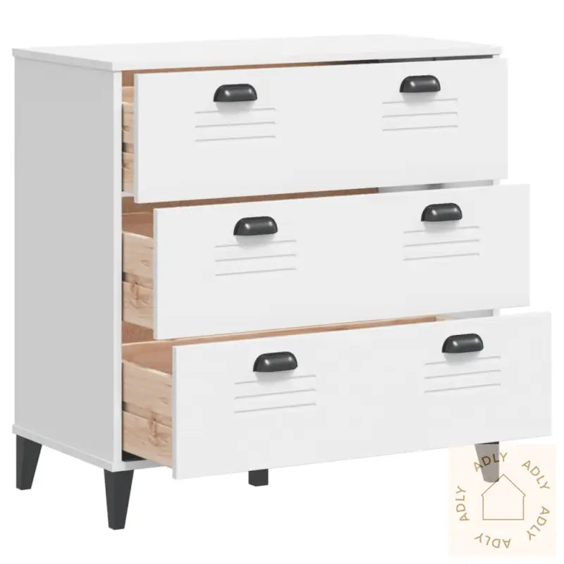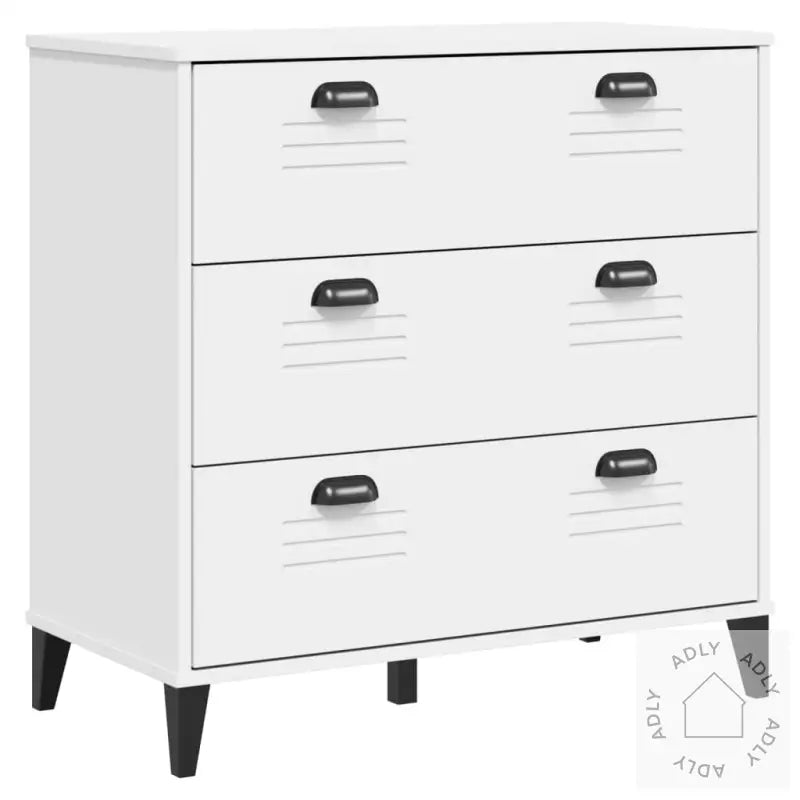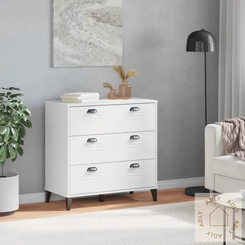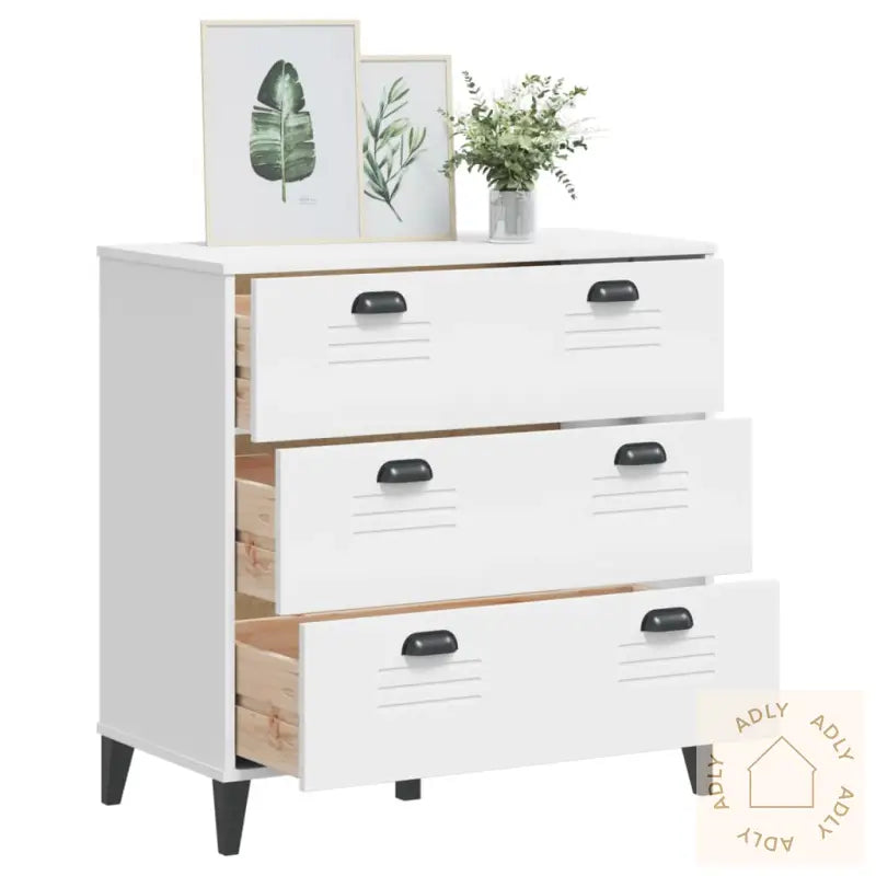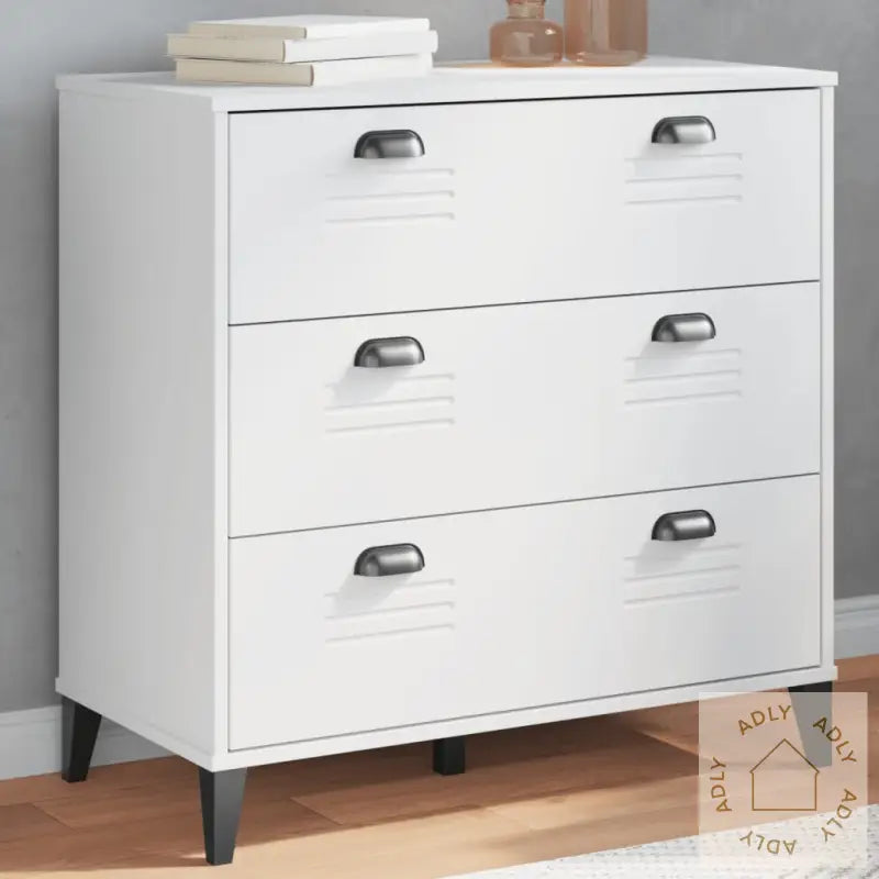 Slitesterkt materiale: Kommoden er laget av konstruert treverk i høy kvalitet. Overflaten er glatt og lett å rengjøre, samtidig som materialet sørger for styrke, solid stabilitet og god motstand mot fukt, noe som gir deg et møbel som varer lenge.Rikelig med oppbevaringsplass: Med tre store skuffer får du enkel plass til klær, dokumenter eller andre småting, slik at du holder rommet oversiktlig og organisert. Alle skuffene er lette å åpne og gir deg rask tilgang til det du trenger i hverdagen.Solid topp: Den robuste toppen gir rikelig med plass til dekorative elementer, som potteplanter, rammede bilder eller andre favoritting – dette gjør kommoden til et naturlig samlingspunkt sammen med andre møbler, som bokhyller eller stående hyller.Praktiske håndtak: Med seks plasthåndtak blir det ekstra enkelt å dra ut skuffene. Håndtakene gir kommoden et moderne uttrykk og bidrar samtidig til både brukervennlighet og et rent, stilrent utseende.Advarsel: