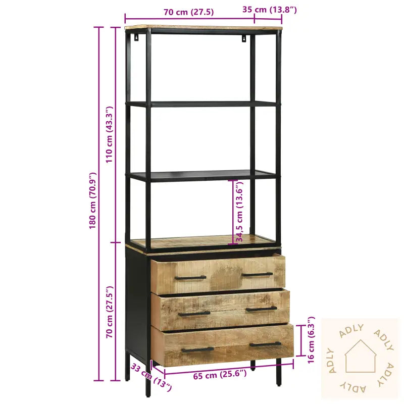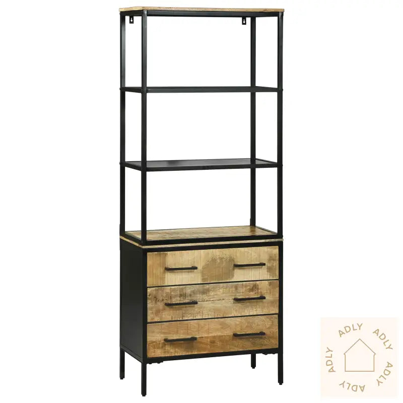Rikelig lagringsplass: Skapet har tre romslige skuffer og to åpne hyller – her kan du alltid oppbevare bøker, dekorasjoner, servise eller kjøkkenutstyr oversiktlig og lett tilgjengelig, enten du vil ha ting gjemt bort eller fremme for enkel bruk.