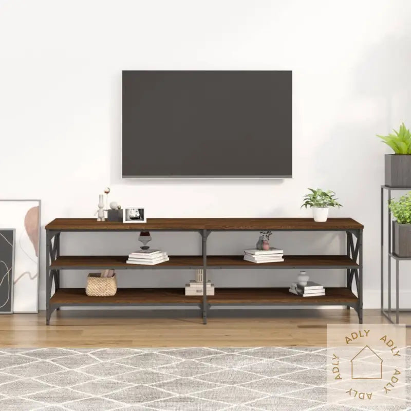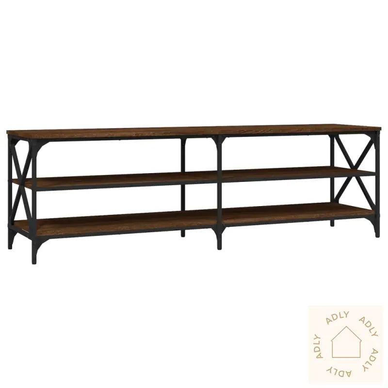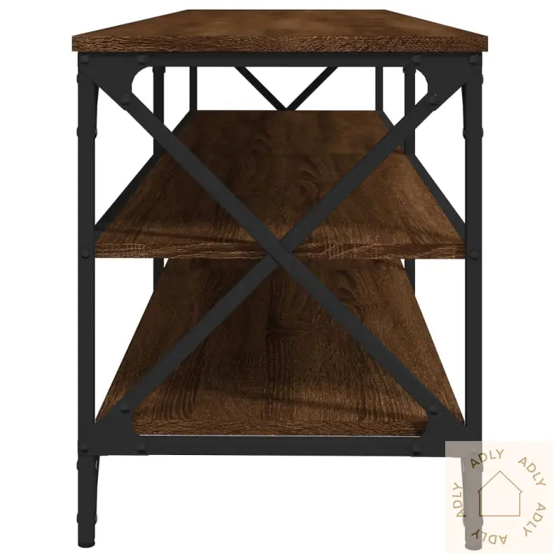 Slitesterkt materiale: TV-benken er laget av høykvalitets konstruert treverk med en jevn og glatt overflate. Materialet gir styrke, stabilitet og motstår fuktighet, slik at dette møbelet forblir flott gjennom mange års bruk, selv i en travel hverdag.Praktisk oppbevaringsplass: Benken har to ekstra hyller som gir god plass til mottakere, bokhyller og stående hyller, spillkonsoller, DVD-er eller annet TV-utstyr. Du får dermed orden på alt som hører til underholdningssonen.Svært stabil ramme: De robuste jernbena og X-formede side-stag gir eksepsjonell støtte. Det gjør benken solid og slitesterk – perfekt når du vil ha møbler til hjemmet som tåler at livet leves rundt dem, år etter år.Justerbare føtter: Skapet kan enkelt plasseres på ujevne gulv, takket være de justerbare føttene. Praktisk løsning for deg som vil sikre stabilitet, også i eldre hus eller på ujevne gulvflater.Stilren topp som kan brukes til dekor: Den solide toppen på TV-møbelet er super for å vise frem dekorative detaljer, for eksempel planter eller fotorammer, så du får satt et personlig preg på stuen.Advarsel: