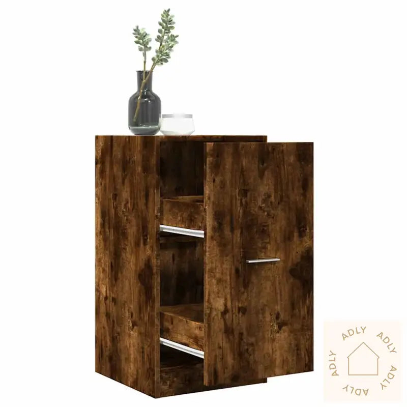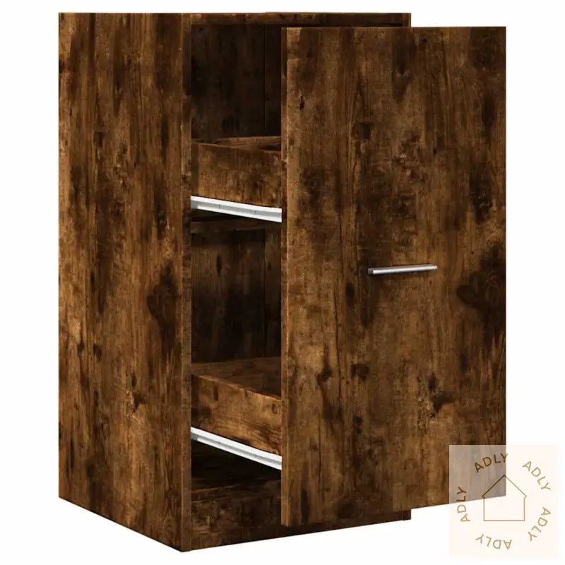 Stabilt og slitesterkt materiale: Skapet er laget av konstruert tre – et robust og stabilt materiale som har en glatt overflate og tåler daglig bruk. Det holder seg pent over tid fordi det står imot fuktighet, vridning og sprekker, så du kan stole på at dette møbelet varer.Rikelig med oppbevaringsplass: Apotekskapet gir deg god plass til alt fra småting til dokumenter, og sikrer at tingene holdes skjult, beskyttet mot støv, og likevel alltid lett tilgjengelig. Perfekt for deg som setter pris på effektive møbler og smart organisering.Svært brukervennlig: Utstyrt med kvalitetsmetallskinner og elegante håndtak glir skuffene lett, noe som gir deg rask og enkel tilgang til innholdet ditt. Dette er viktig for deg som vil ha hverdagskomfort og kvalitet i ett og samme møbel.Allsidig: Med sitt klassiske design og nøytrale uttrykk kan skapet brukes som apotekskap, vanlig oppbevaringsskap, kjøkkenskap, eller til og med som en del av et større hyllesystem. Den passer like fint sammen med bokhyller og stående hyller som frittstående, så det er lett å tilpasse etter personlig stil og behov.Advarsel: