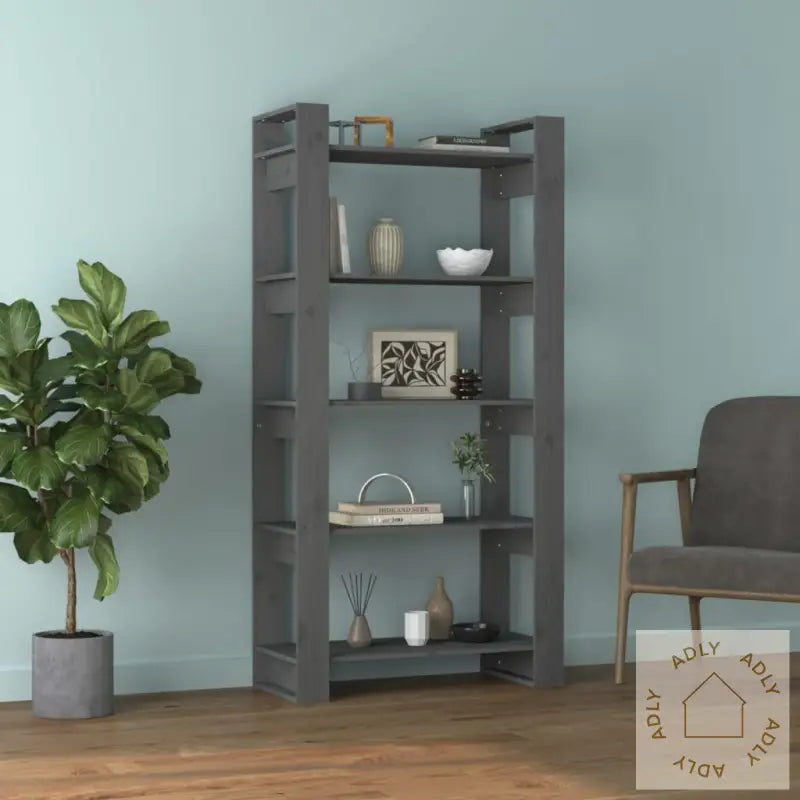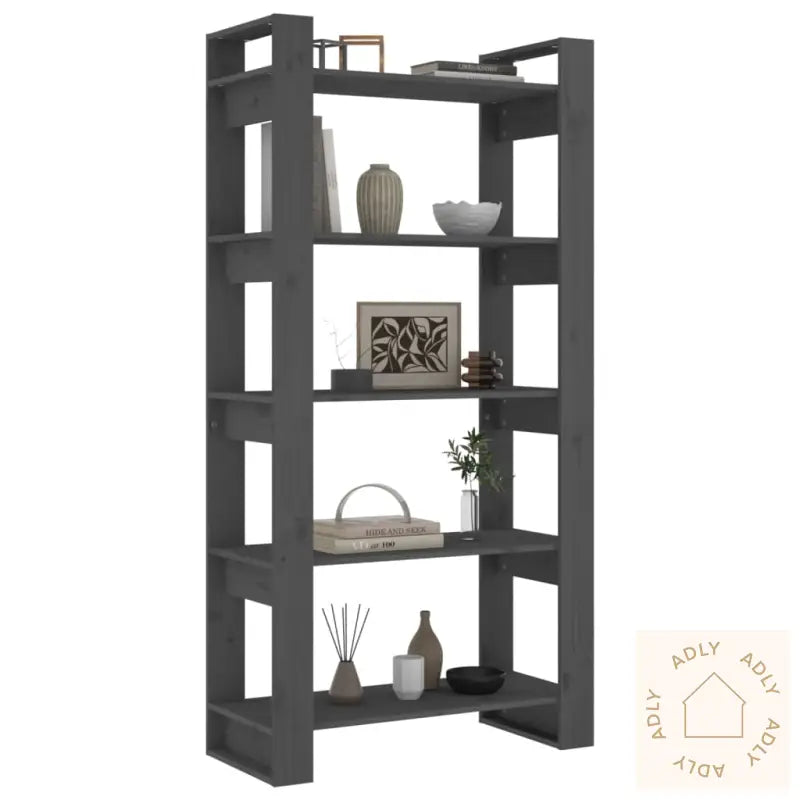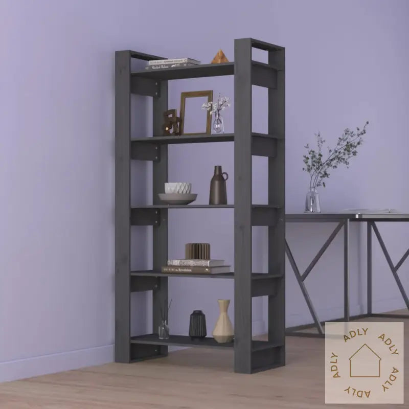 For å forhindre at produktet velter, må du alltid bruke de medfølgende festemidlene for å sikre bokhyllen til veggen.Farge: gråMateriale: heltre furuSamlet mål: 80 x 35 x 160 cm (B x D x H)Kan brukes som bokhylle eller romdelerMontering kreves: ja