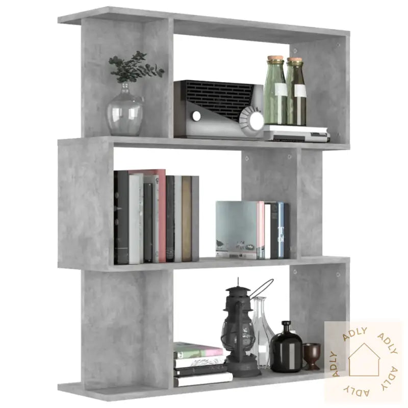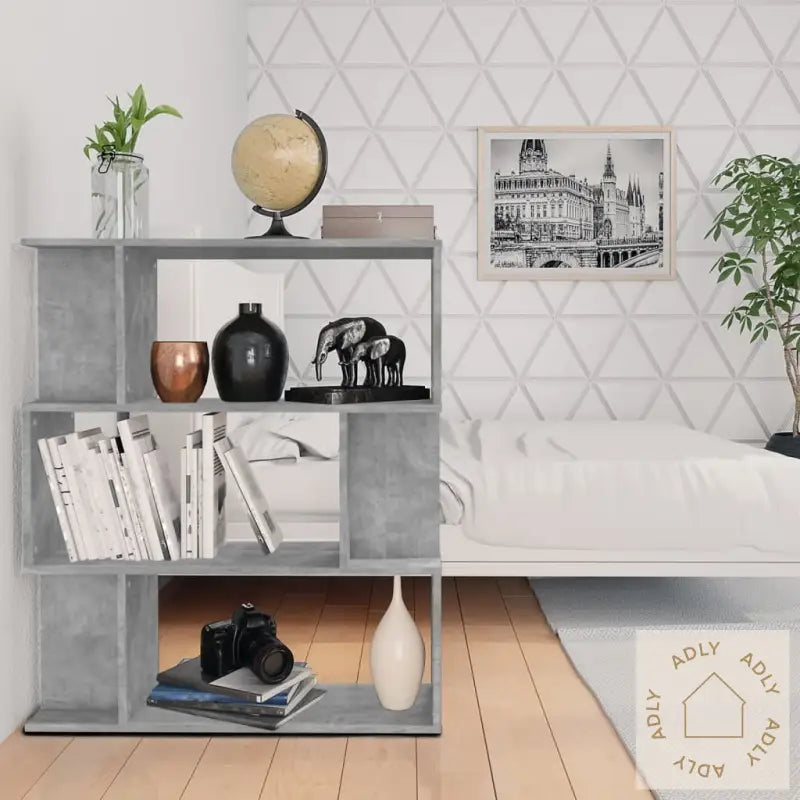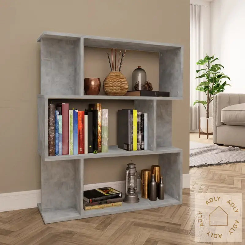 Farge: betonggråMateriale: konstruert treMål: 80 x 24 x 96 cm (B x D x H)3 store og 6 små oppbevaringsrom gir god plass og smart organiseringKan brukes som romdeler – ideell for moderne hjeminnredningMonteringsmaterialer inkludert for enkel montering