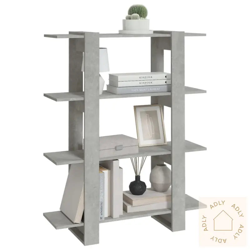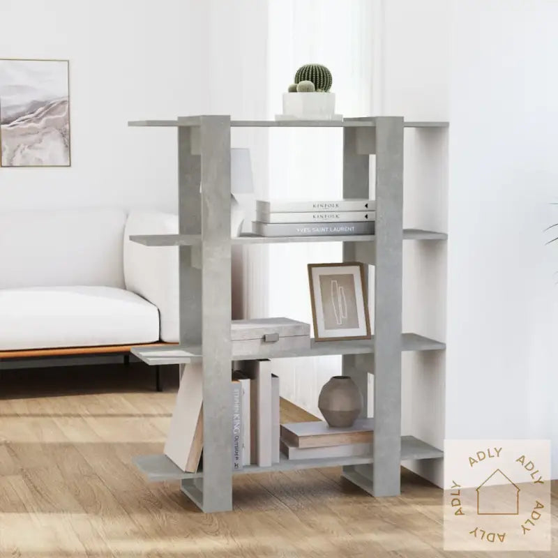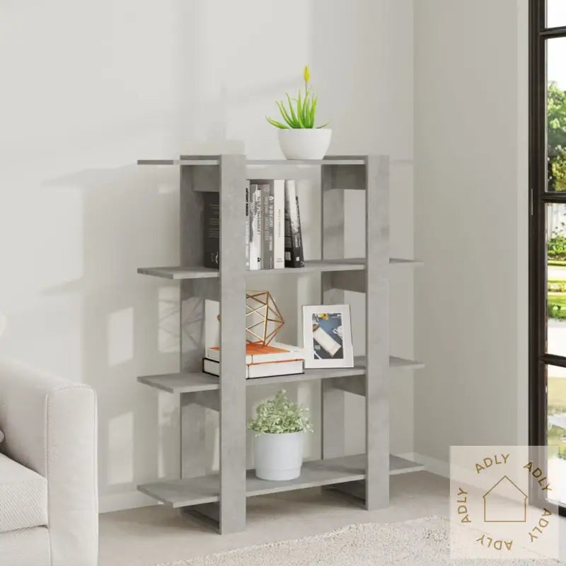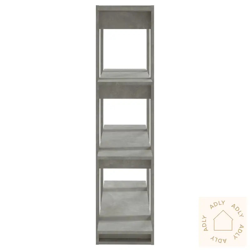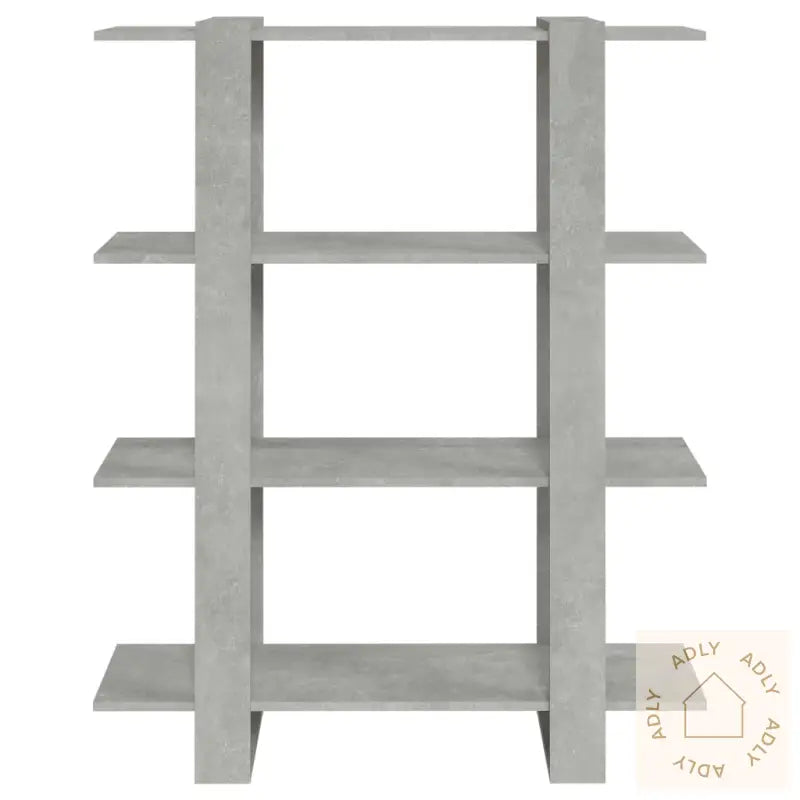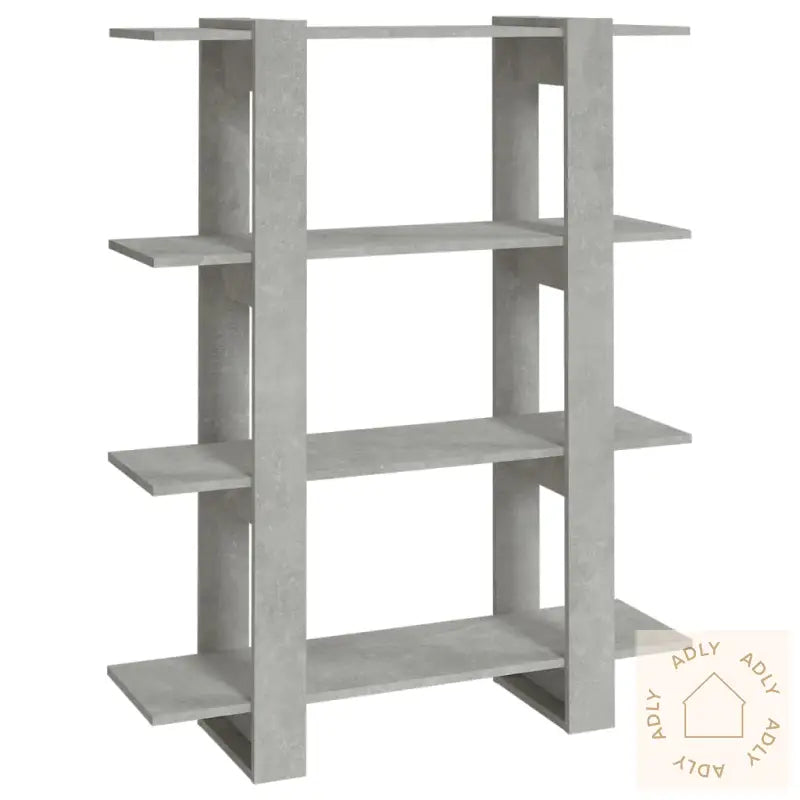 Farge: betonggråMateriale: konstruert treSamlet mål: 100 x 30 x 123,5 cm (B x D x H)Mål hver hylle: 100 x 27 x 35 cm (B x D x H)Kan brukes som bokhylle eller romdelerMontering kreves: jaADVARSEL: For å forhindre at produktet velter, må medfølgende festemidler for vegg brukes.
