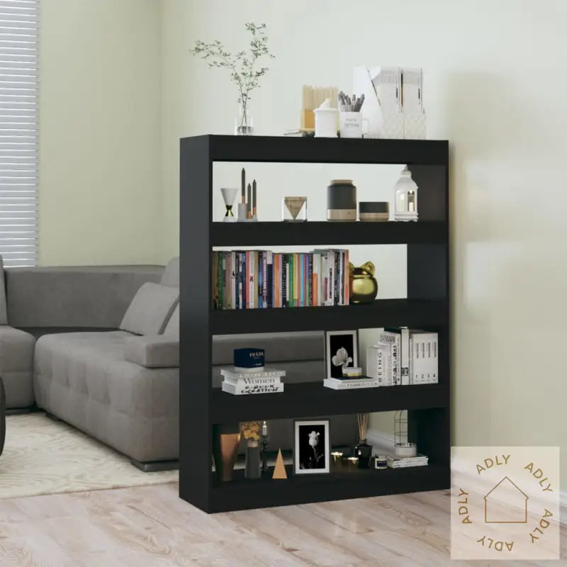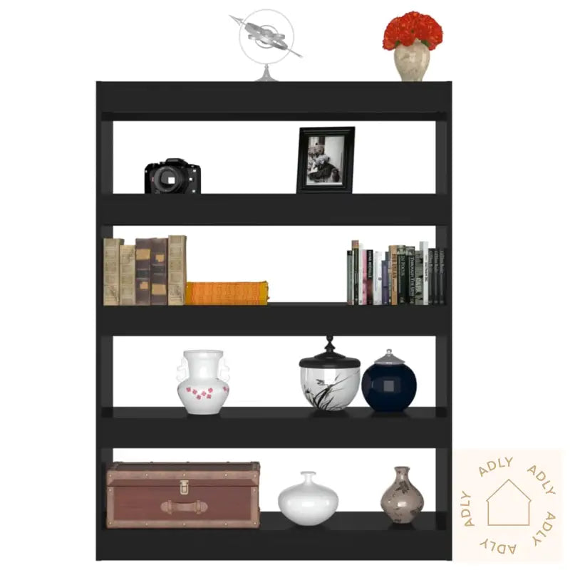 Farge: svartMateriale: konstruert treSamlet mål: 100 x 30 x 135 cm (B x D x H)Høyde hver hylle: 26,5 cmKan brukes som bokhylle eller romdelerMontering kreves: jaADVARSEL: For å forhindre at produktet velter, må medfølgende festemidler for vegg brukes.