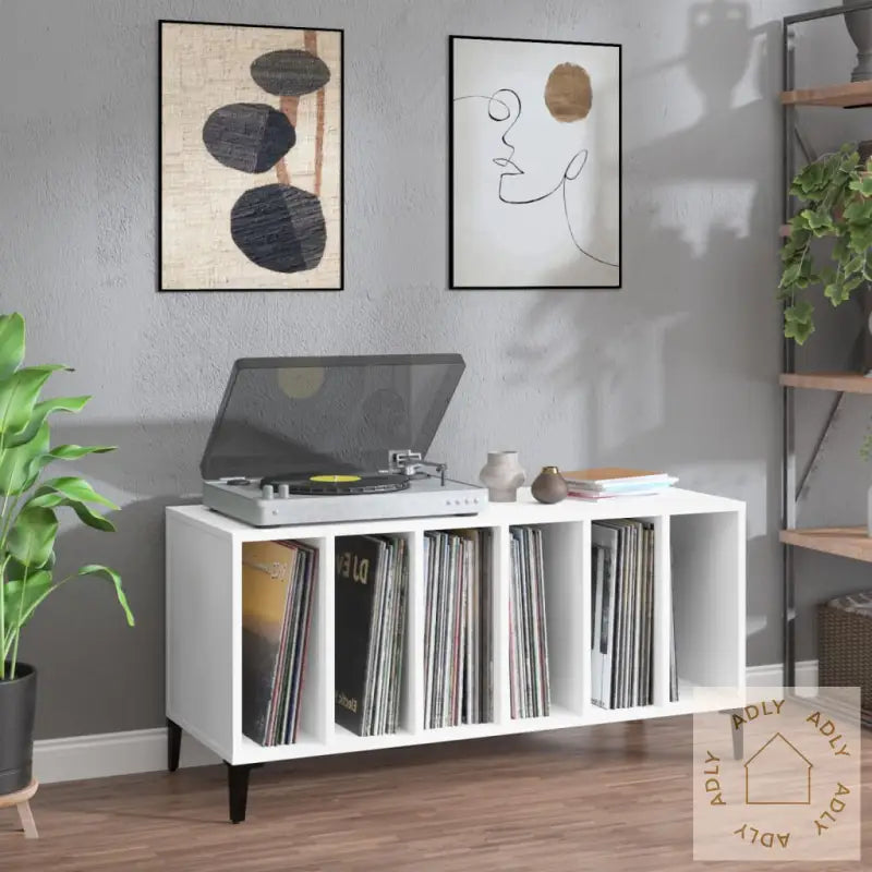Slitesterkt materiale: Benken er laget av konstruert treverk i høy kvalitet, kjent for sin styrke og stabilitet. Overflaten er glatt og enkel å rengjøre, samtidig som den tåler fuktighet i hverdagsbruk.Rikelig lagringsplass: Platespillerskapet har god plass til alle LP-platene dine, så musikksamlingen forblir ryddig og lett tilgjengelig. Hyllene kan også brukes til bøker, magasiner eller småpynt hvis du ønsker å kombinere funksjonene til bokhyller og stående hyller.Solid topp: På toppen finner du en robust flate hvor du trygt kan sette platespiller, stereoanlegg eller annen elektronikk – det gjør benken like egnet til underholdning som for organisering.Flere funksjoner: Denne HiFi-benken er ikke bare flott til musikkutstyr. Du kan også bruke den som TV-benk, ekstra sideskap til stua eller som arkivskap på hjemmekontoret. Den enkle, tidløse stilen gjør at møbelet sklir rett inn blant mange ulike typer møbler.Metallben: De solide føttene i metall gir interiøret et moderne, industrielt preg samtidig som de sørger for at benken står støtt, uansett om du bruker den til HiFi-utstyr eller som deler av bokhyller og stående hyller-løsninger.Farge: hvitMaterialer: konstruert tre, metallMål: 100 x 38 x 48 cm (B x D x H)Montering kreves: ja