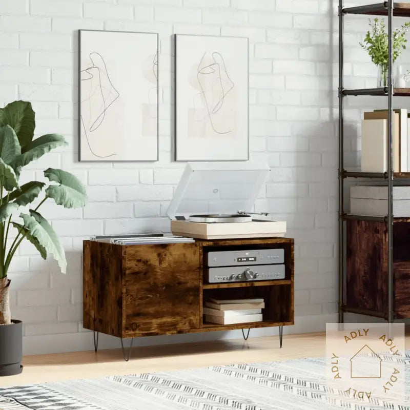 Slitesterkt materiale: Det konstruerte treverket har en glatt og elegant overflate som gir hifi-benken både styrke og lang levetid. Materialet tåler daglig bruk, bidrar til stabilitet og har god motstand mot fukt, noe som gjør det egnet for ulike hjemmemiljøer.Rikelig lagringsplass: Dette platespillerskapet rommer mange LP-plater slik at du får orden på samlingen din. I tillegg gir den åpne utformingen oversiktlig og enkel tilgang, enten du skal bla i musikken eller plassere dekorative bokhyller og stående hyller sammen med platene.Solid topp: Øverst finner du en robust plate, designet spesielt for å bære platespilleren din trygt – men den fungerer også ypperlig til annen elektronikk eller små møbler.Jernføtter: De solide jernføttene løfter innredningen med en rå industriell vri, og sørger for at benken står stødig på gulvet uansett om den brukes til LP-er eller som en del av samlingen dine øvrige møbler.Farge: røkt eikMaterialer: konstruert tre, jernSamlet mål: 85 x 38 x 48 cm (B x D x H)Høyde fot: 10 cmMontering kreves: ja