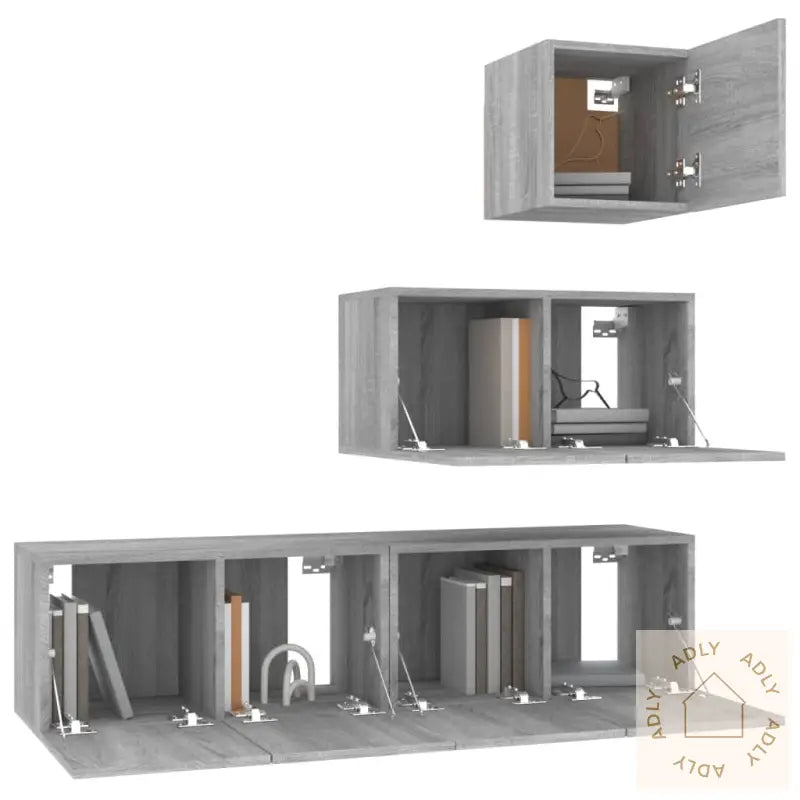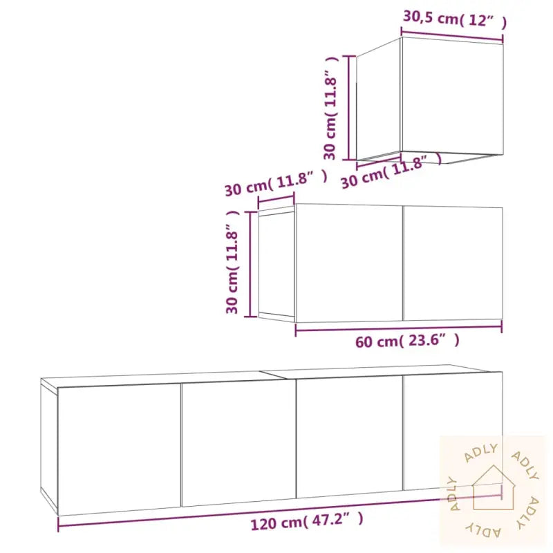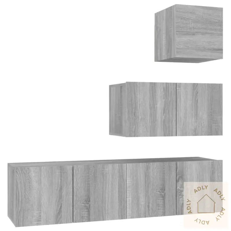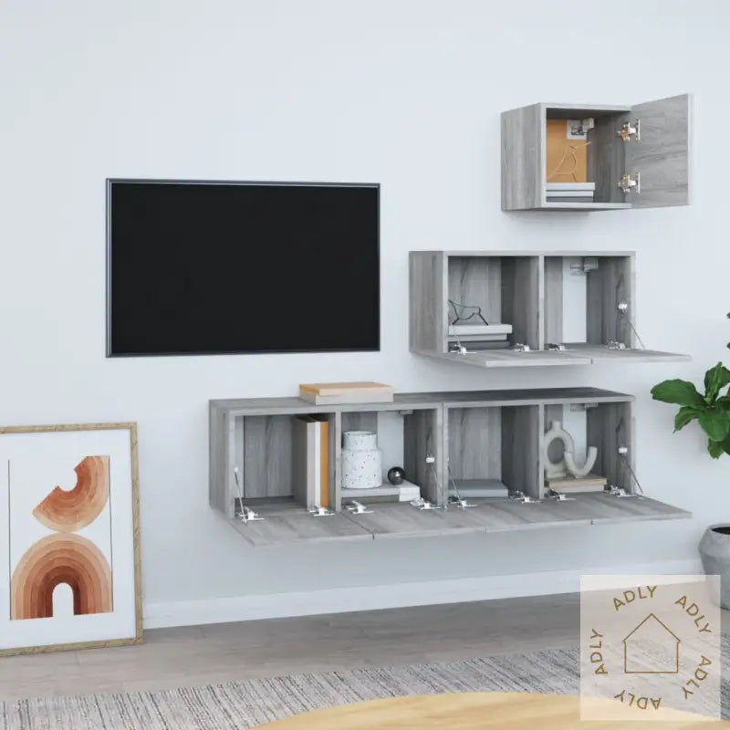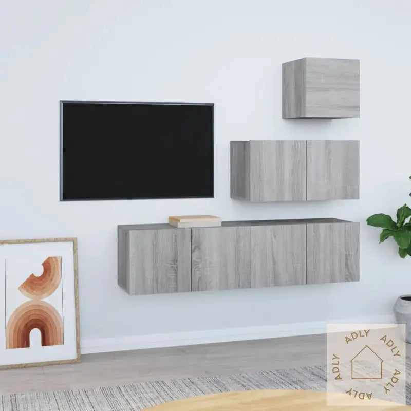 Skruer og plugger for feste i vegg følger ikke med. Velg riktige varianter som passer veggen din, og ta gjerne kontakt med fagfolk hvis du er usikker. Følg instruksjonene trinn for trinn for best resultat.Alle produkter leveres med en enkel monteringsveiledning i pakken, slik at montering av TV-skapet går raskt og smertefritt.Farge: grå eik — matcher flere stiler, fra skandinaviske til mer industrielle interiører.Materiale: konstruert tre gir slitestyrke og et elegant uttrykk.Mål tv-skap (stort): 60 x 30 x 30 cm (B x D x H) gir fleksibel plass til elektronikk og dekor.Mål tv-skap (små): 30,5 x 30 x 30 cm (B x D x H), ideelle for mindre gjenstander eller som ekstra oppbevaringsmodul.Leveransen inneholder:3 x TV-skap (store)1 x TV-skap (lite)Uansett om du trenger mål tv-skap for en liten leilighet eller som del av en større innredning hjemme, gir dette settet deg fleksibilitet og funksjonalitet – og et løft for rommets uttrykk.