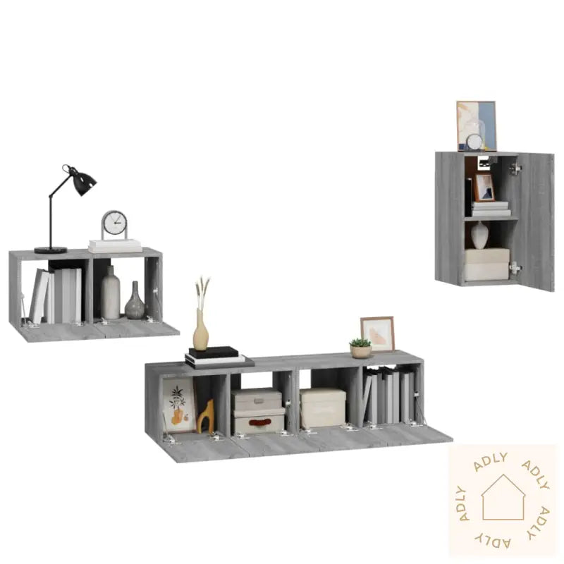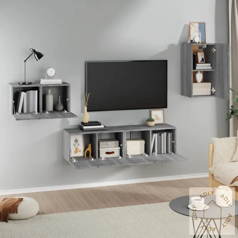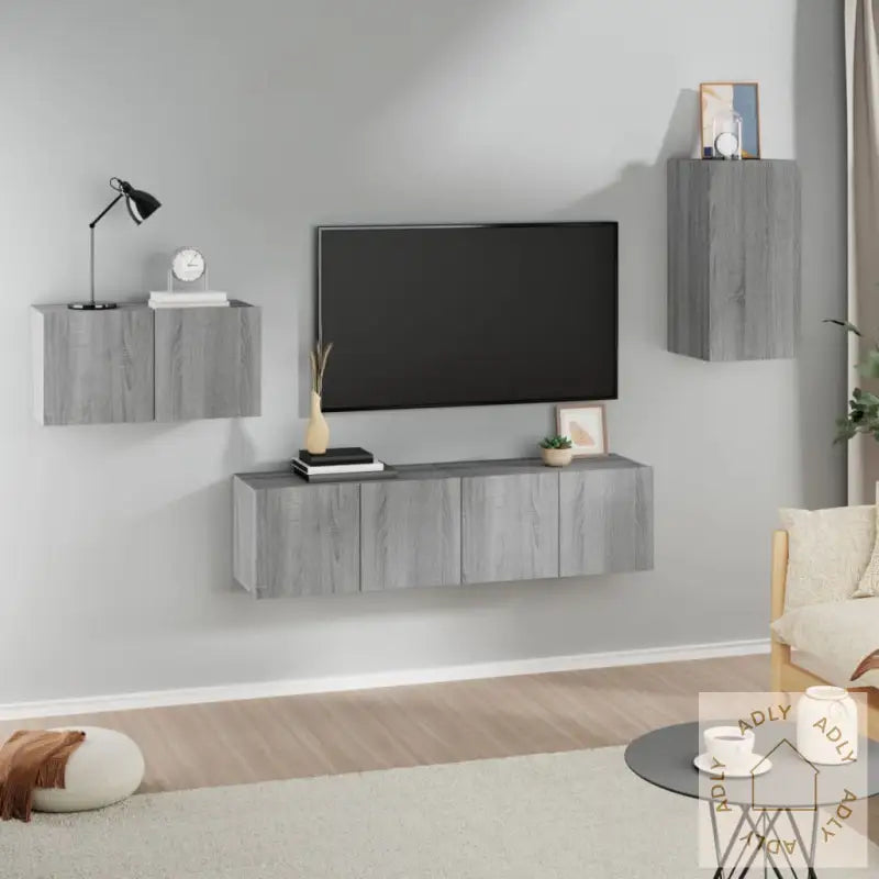 Skrue(r) og plugg(er) til montering på vegg følger ikke med. Sørg for å finne skruer og plugger som passer til akkurat dine vegger, spesielt siden ulike veggtyper krever ulikt festemateriell. Kontakt gjerne profesjonelle hvis du er usikker, og følg monteringsanvisningen nøye.Alle produktene leveres med en brukervennlig monteringsveiledning som gjør det enkelt å sette sammen møbelet på egenhånd.Farge: grå eik for en tidløs og moderne stil som matcher andre møbler og gir et lunt preg i hjemmet.Materiale: konstruert tre av høy kvalitetPakken inneholder:3 x TV-benker: 60 x 30 x 30 cm (B x D x H)1 x TV-benk: 30,5 x 30 x 60 cm (B x D x H)